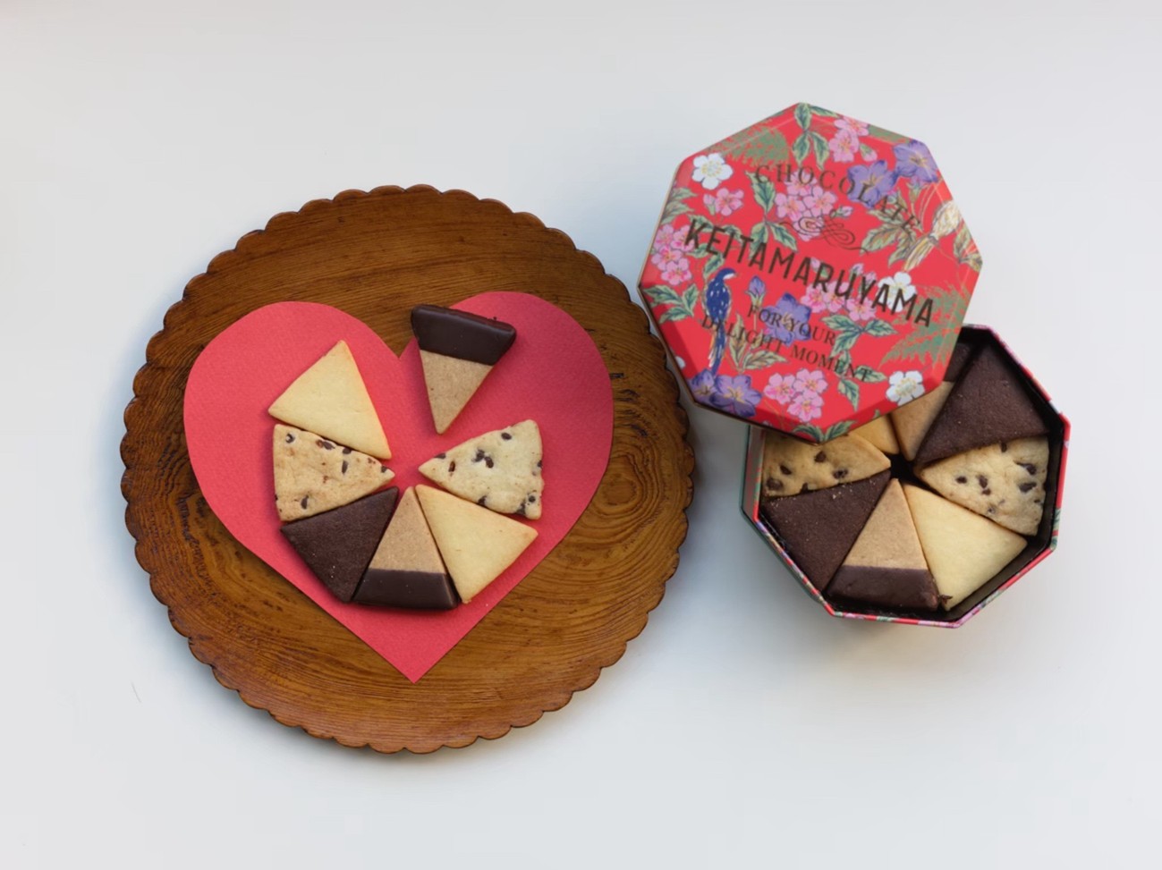 【新作】詰合せクッキー缶(Birds in Bloom)価格:3,780円(税込) 華やかな赤を基調とした花鳥柄のアーカイヴデザインを使用した八角形の缶に、三角型のクッキー5種を美しく詰め合わせました。小さすぎず大きすぎない程よいサイズ感で、開けた瞬間の華やぎと特別感を楽しめる一缶に仕上げています。 |