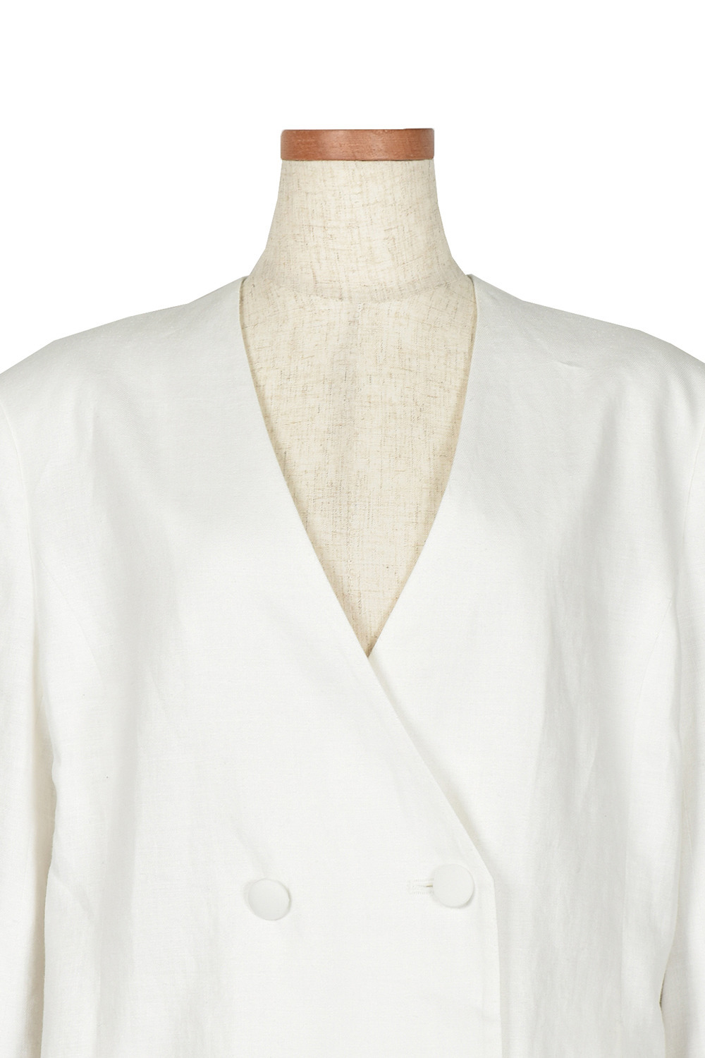 この「majotae」のファブリックを使ったジャケットは、フロントはベーシックなノーカラーのダブルジャケットの仕立てで、バックには大きくスリットが入り、リボンで結んでアクセントをプラス。
