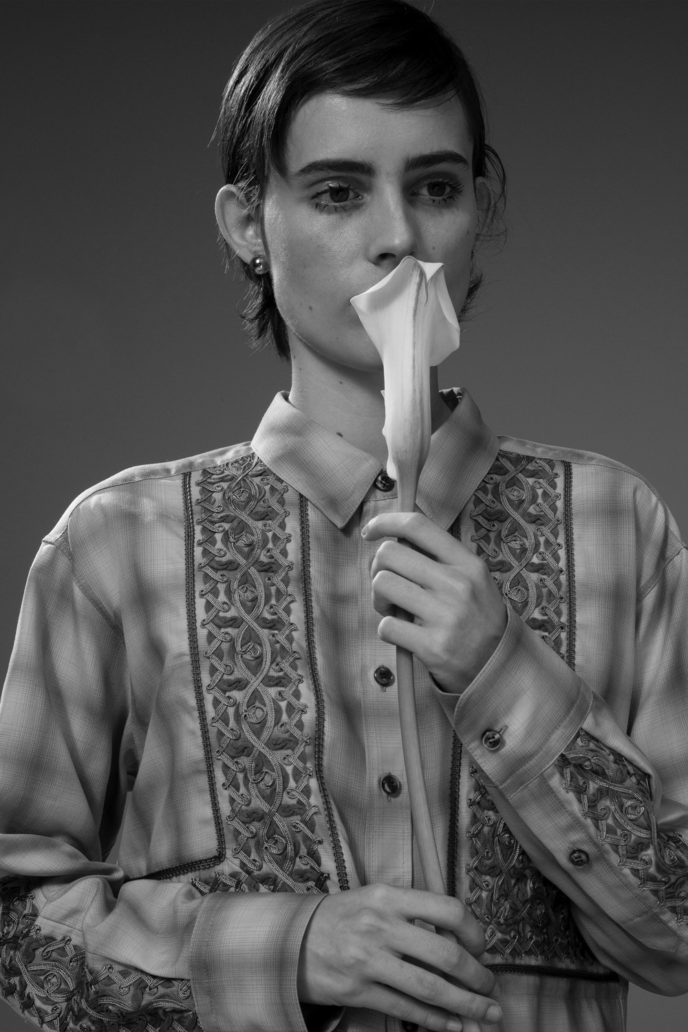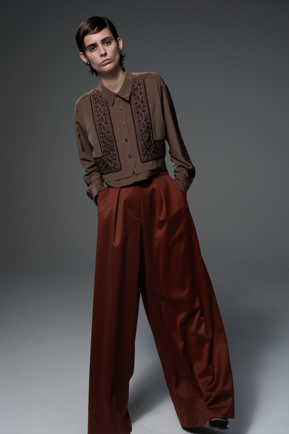 やわらかな素材とシャツライクな仕立てに、複数のブレードを使用した刺繍がリュクスに。