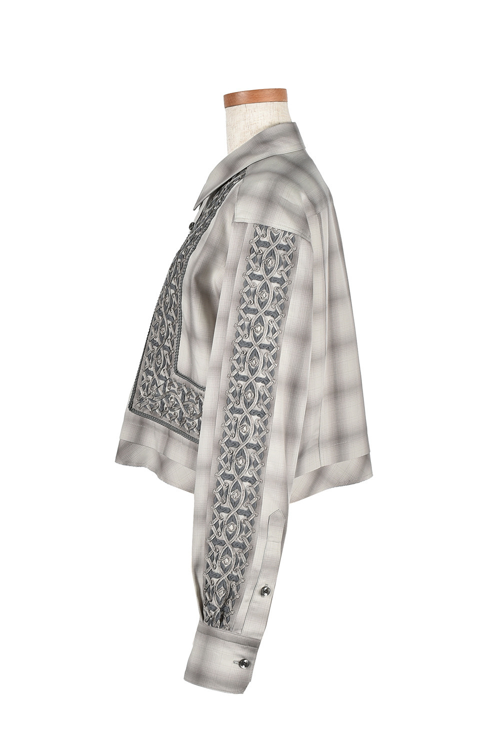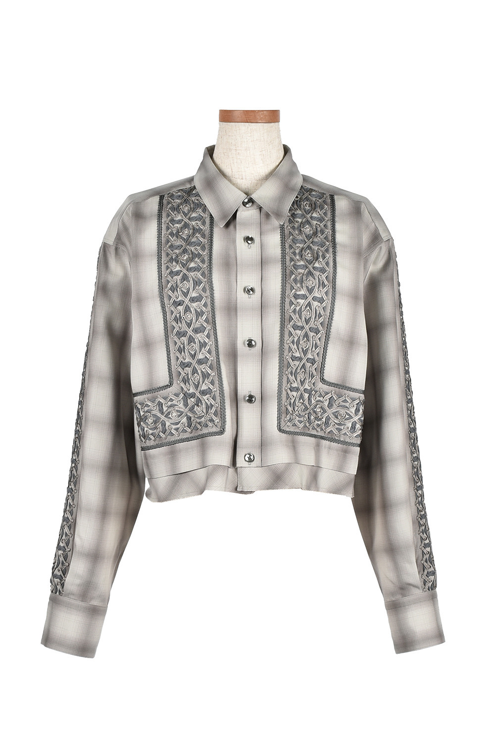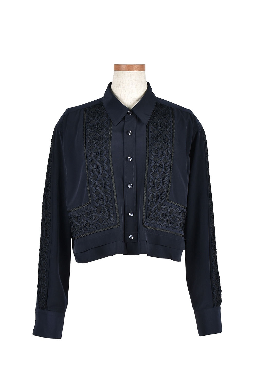 身ごろや袖にたっぷりとブレード刺繍を施した、ショート丈シャツブラウス。