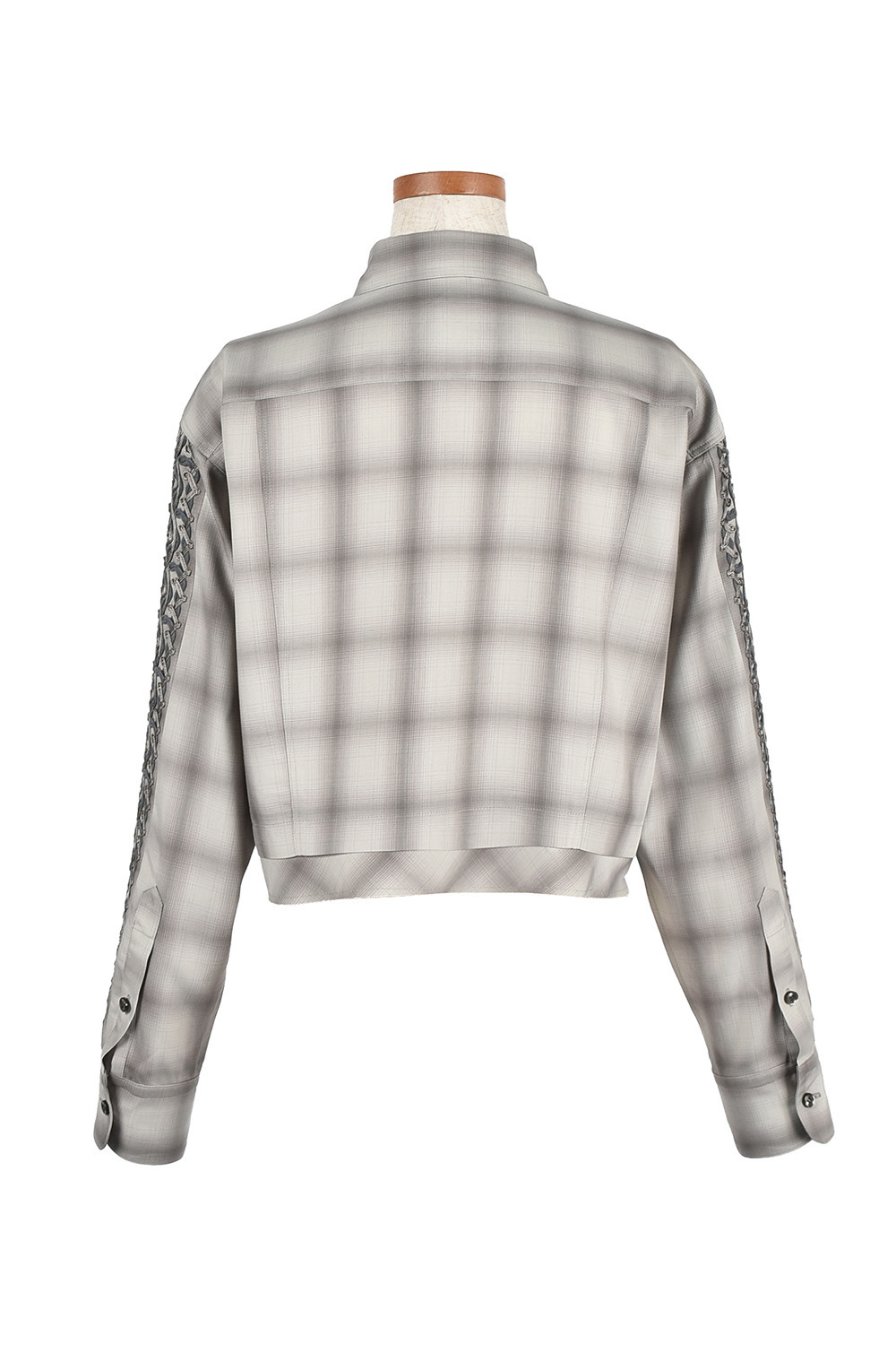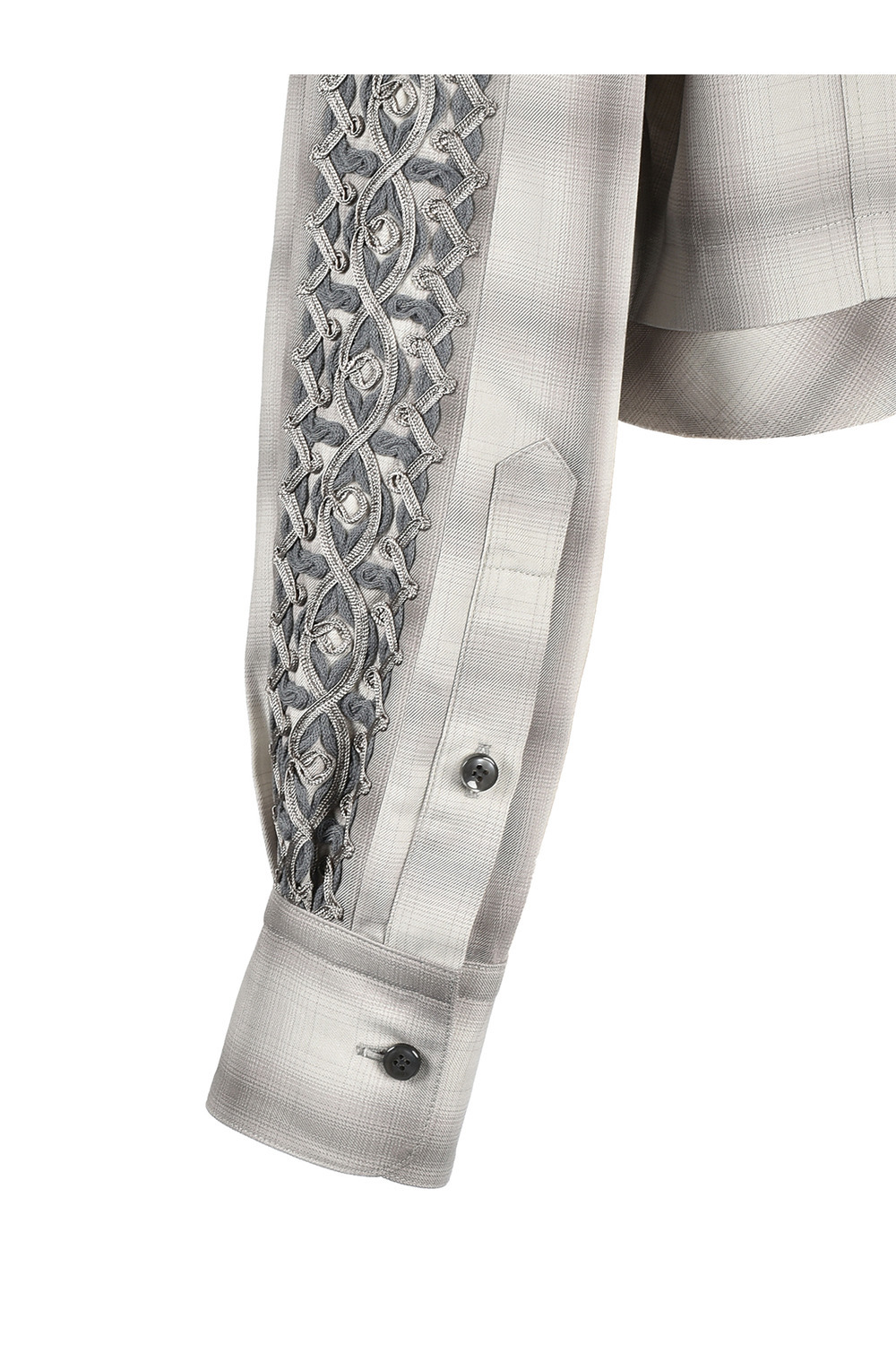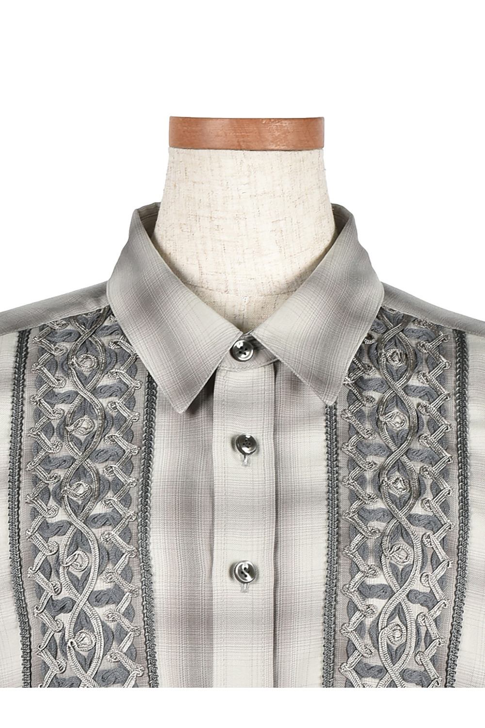 身ごろや袖にたっぷりとブレード刺繍を施した、ショート丈シャツブラウス。