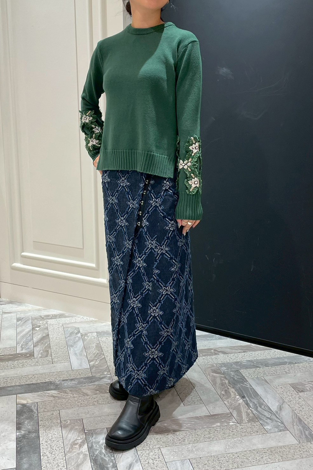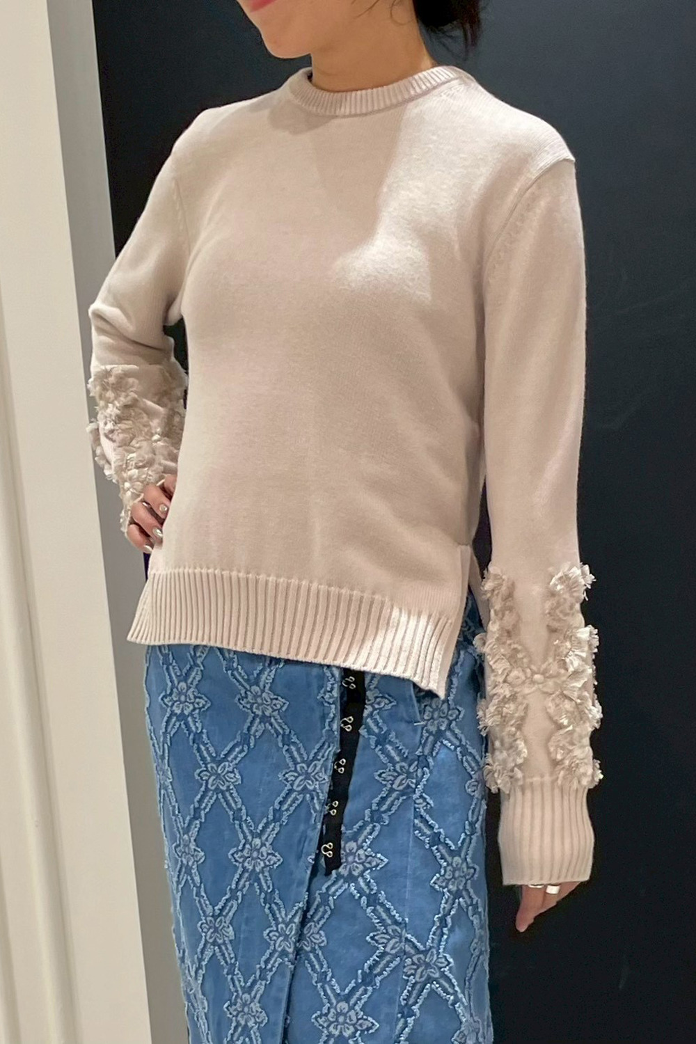 少しワイドめなネックラインで、フェミニンなニットプルオーバー。袖口にはフラワー刺繍とフリンジ刺繍を施し、華やかに仕上げました。