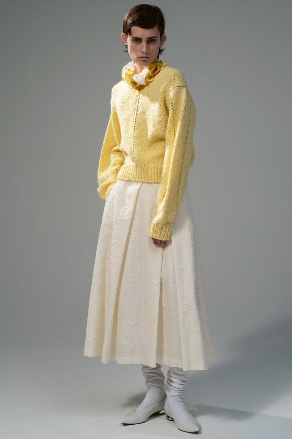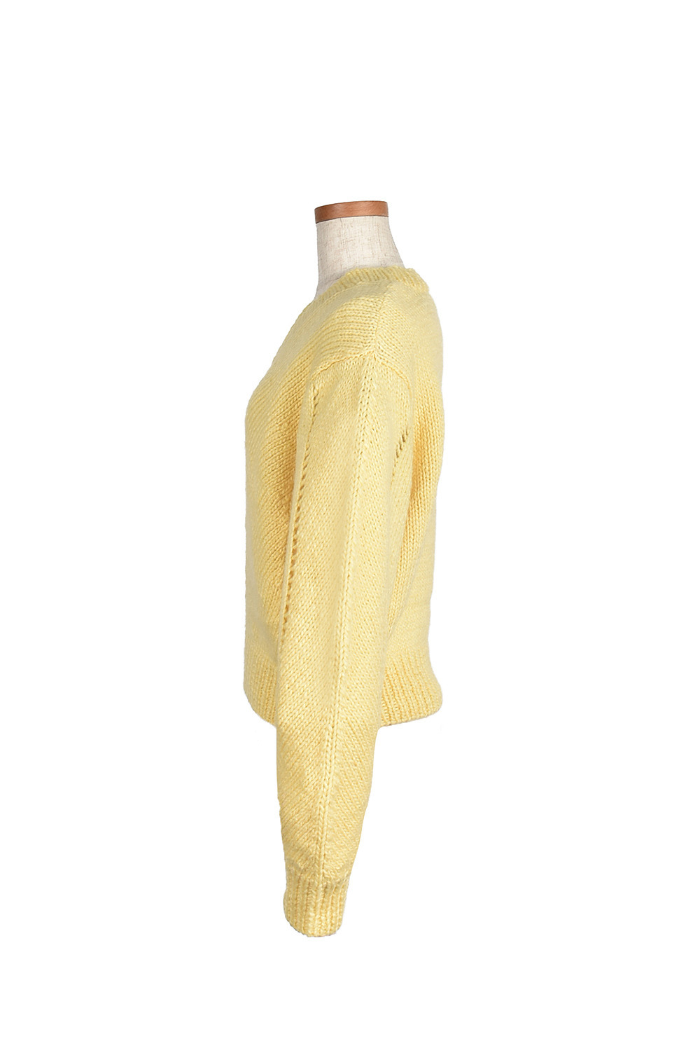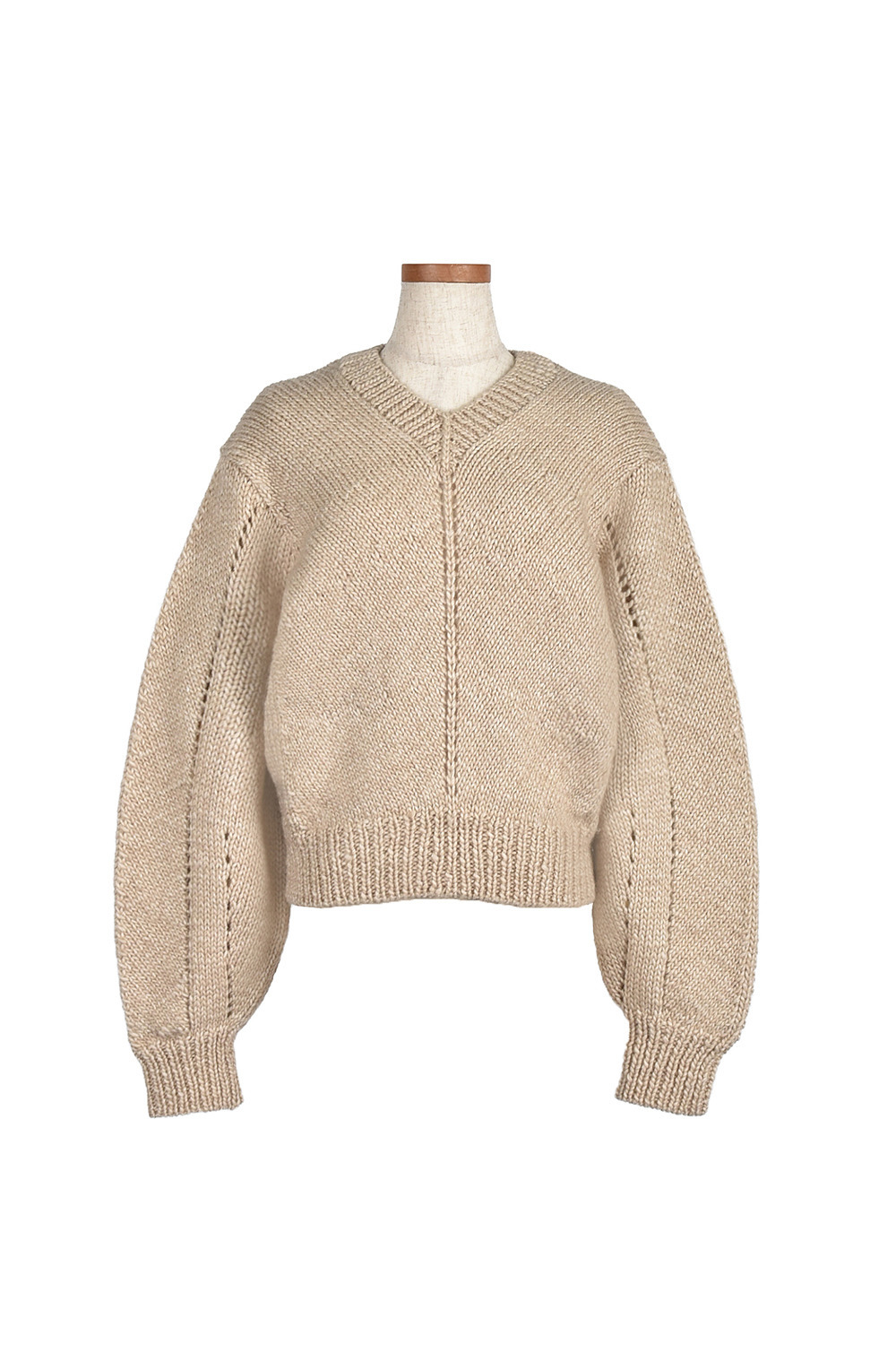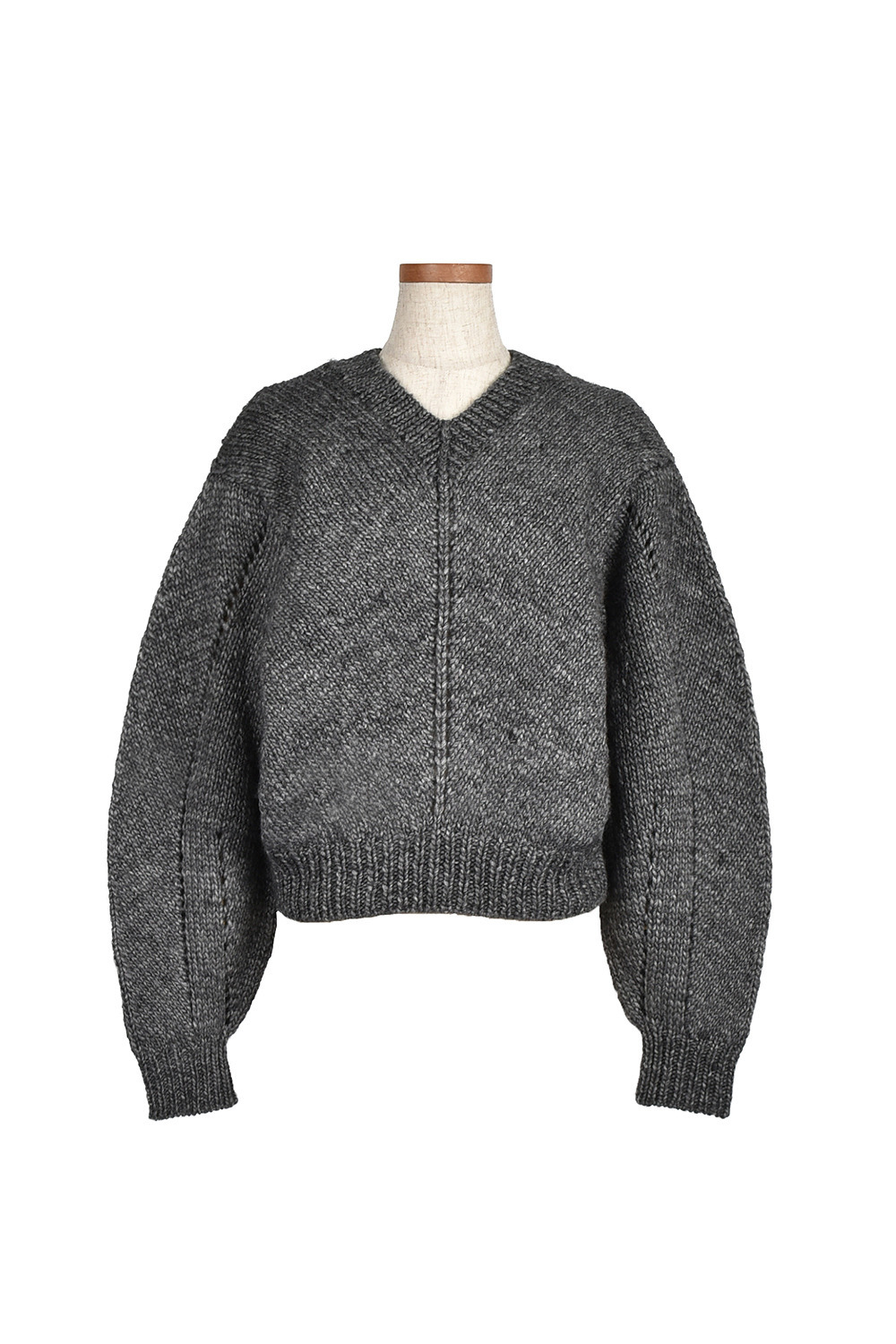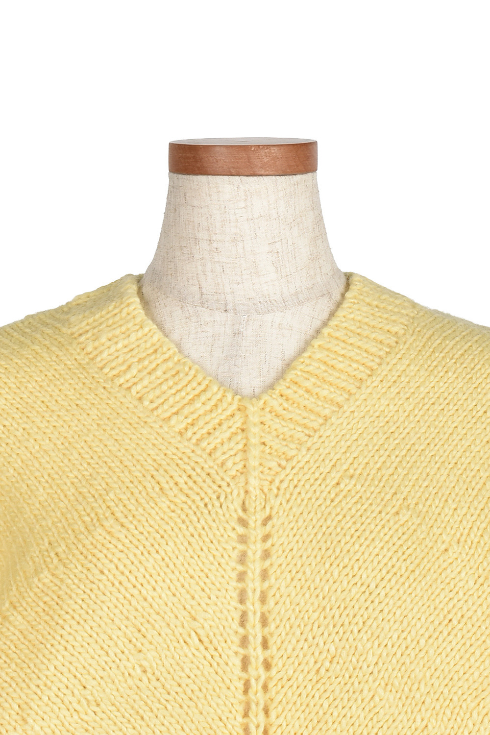 Vネックのニットプルオーバーはねじりを加えた糸を用い、無地でも表情のある表面感が特徴です。