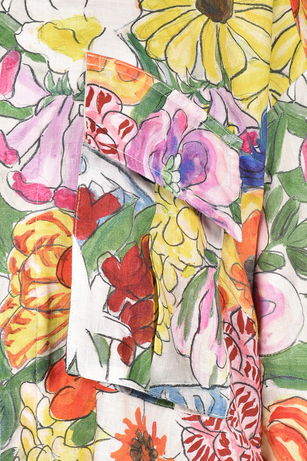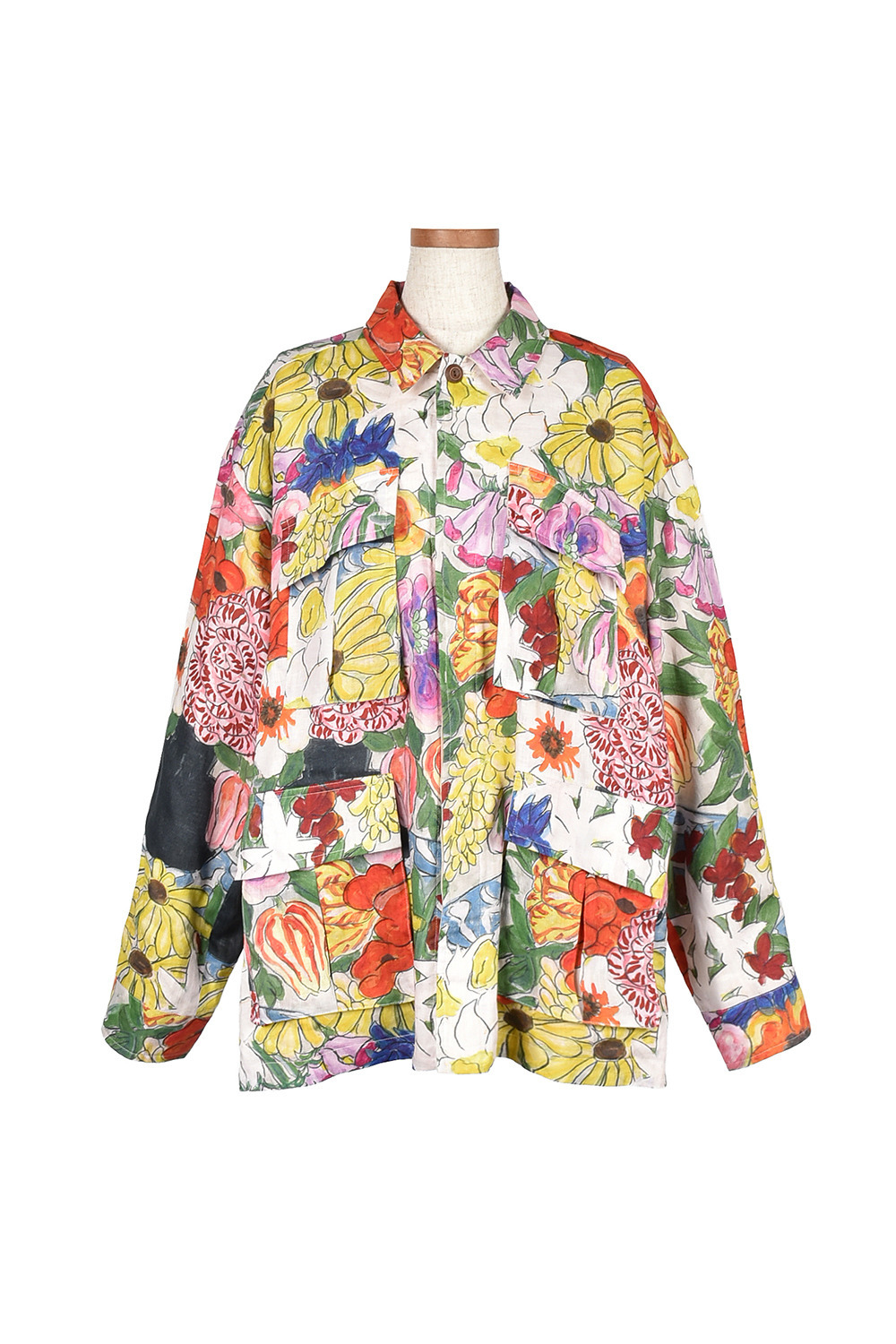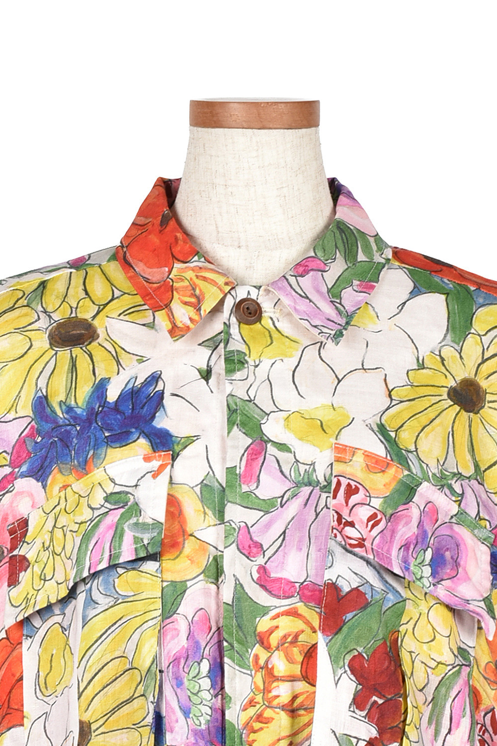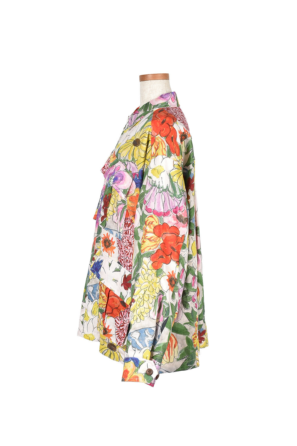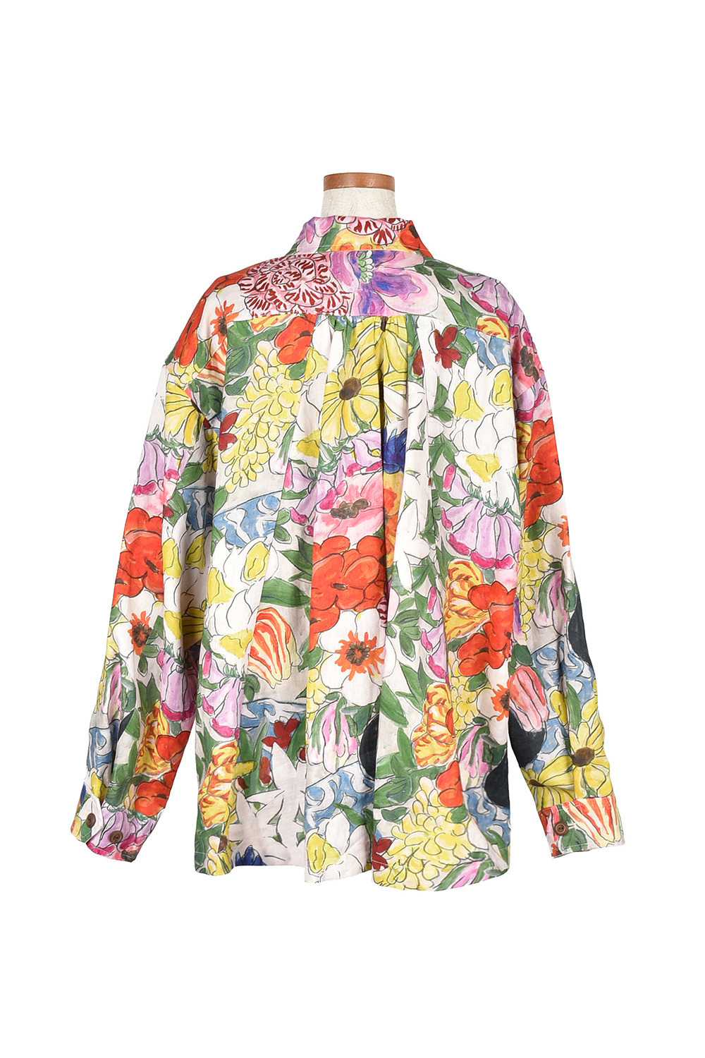 今回のコレクションのために門倉氏が描き下ろしたアートをプリントし、筆致まで味わえる鮮やかなオリジナルの麻生地に仕上げました。
