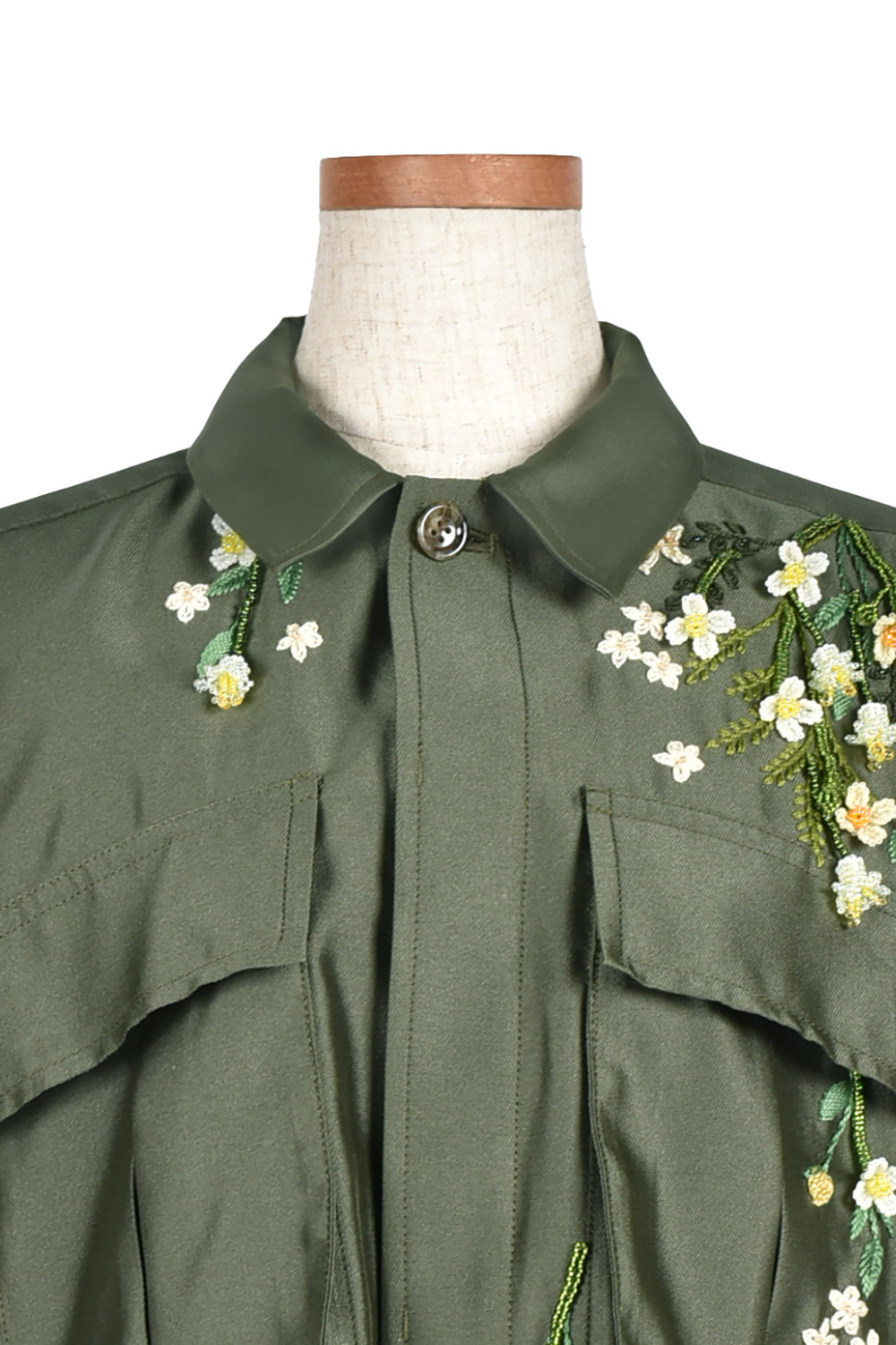 ステッチや大きなフラップポケットなど、カバーオールらしさを残しつつ、比翼仕立てなどで装飾の存在感を抑え、刺繍の美しさを最大限に引き立てています。