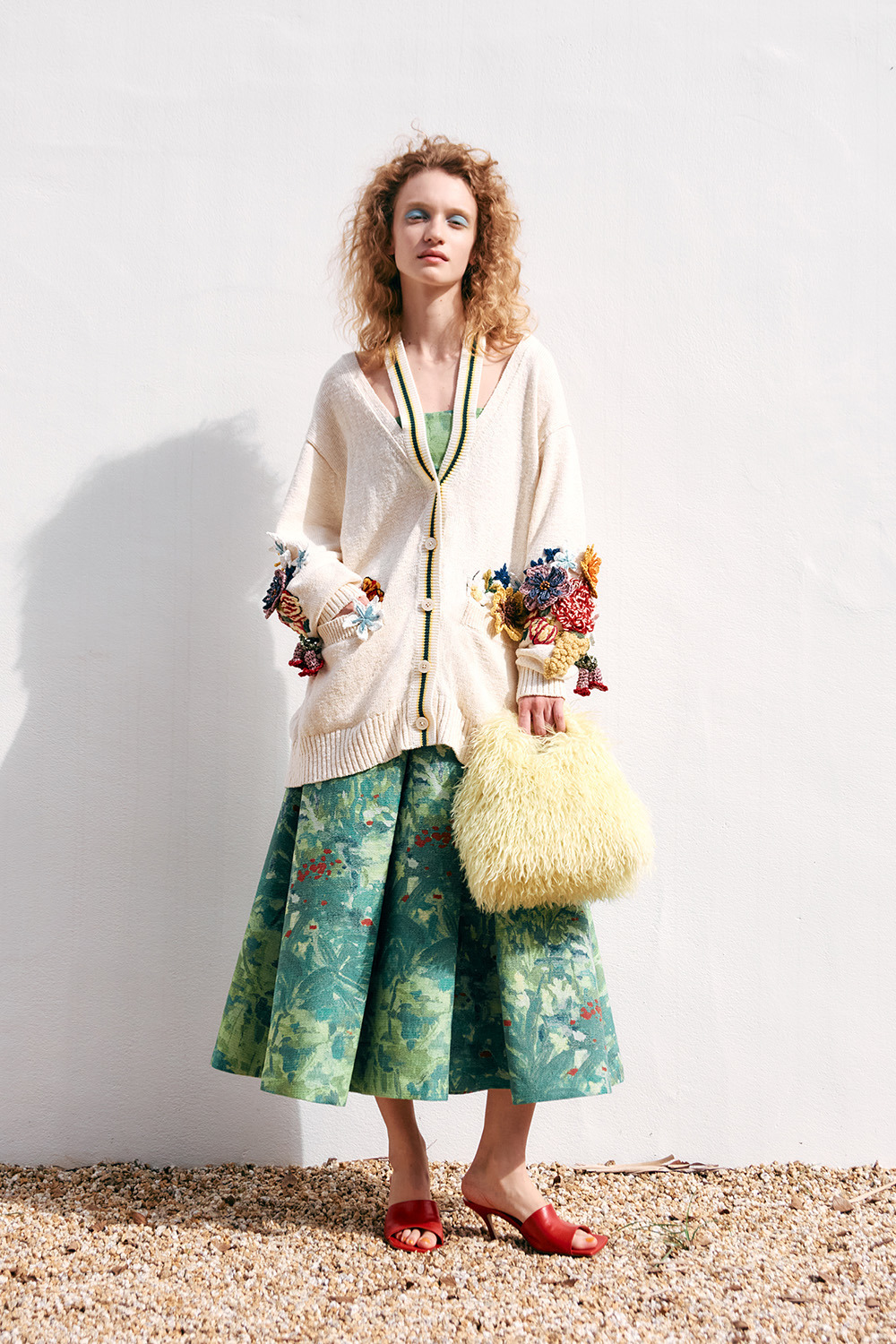 ハリのある素材がシルエットを美しく保ち、重なり合うアートの表情が奥行きを深めています。