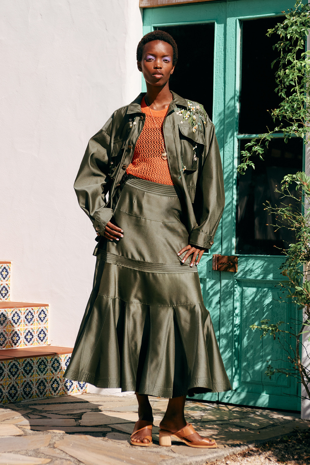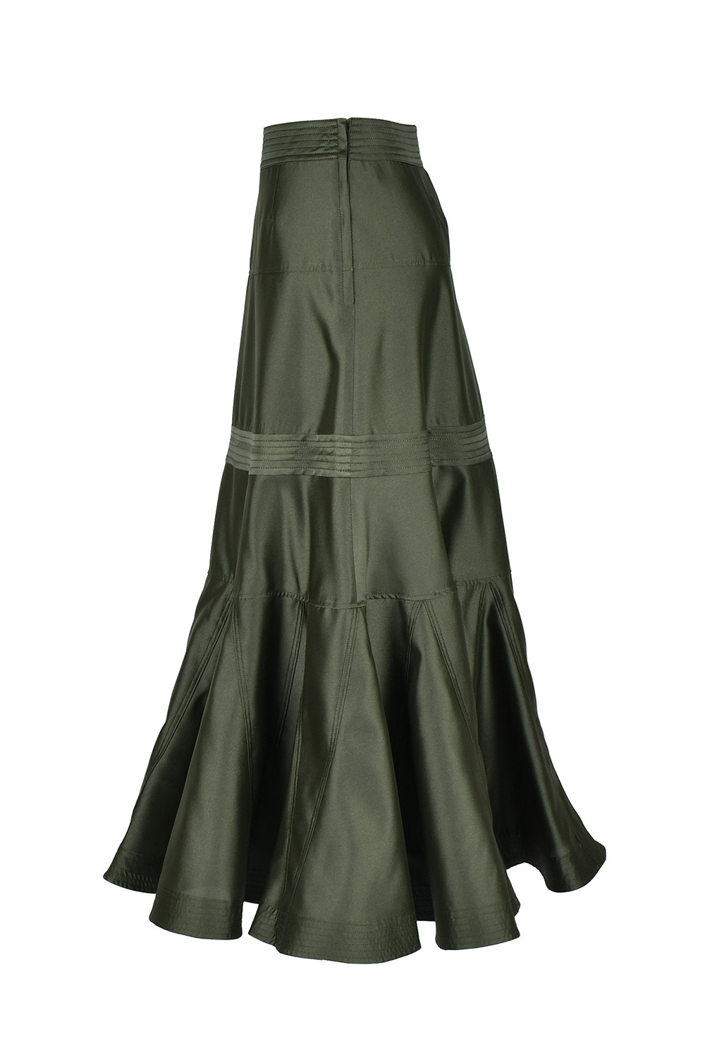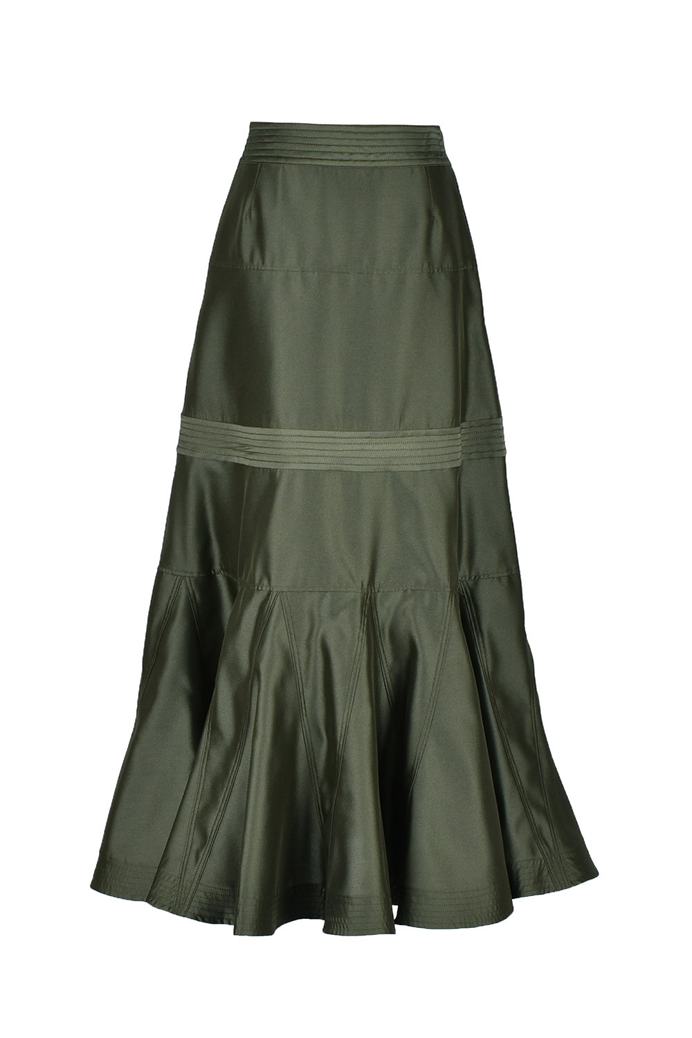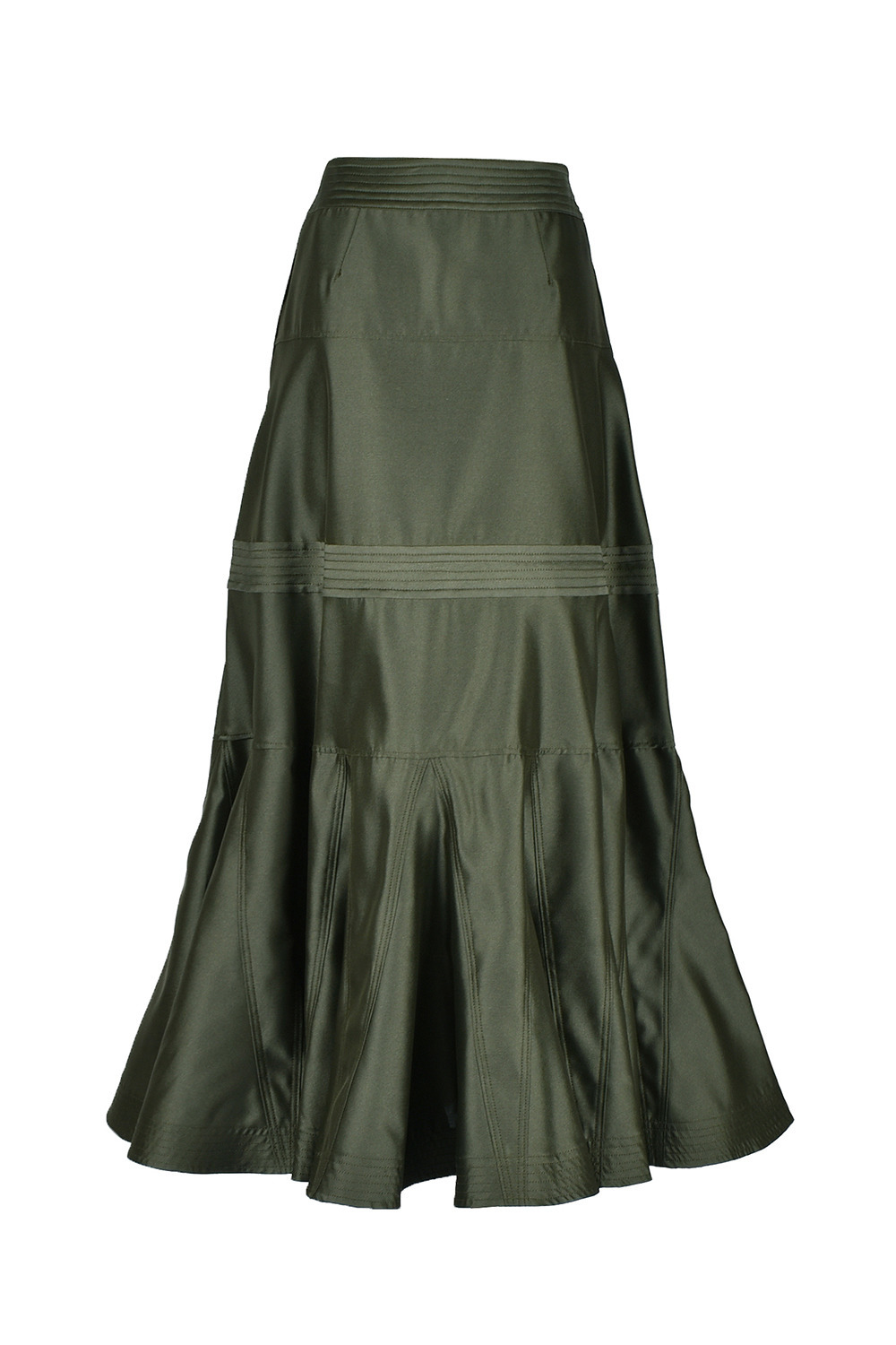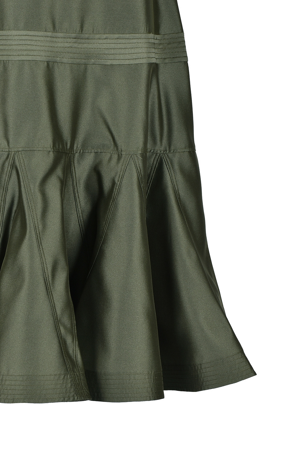 <細かく切り替えを入れ、裾には細かく生地を挟みこむことで、フィット&フレアなシルエットのスカートは、ステッチの色を生地と同色にし、きれい目な印象に仕上げています。