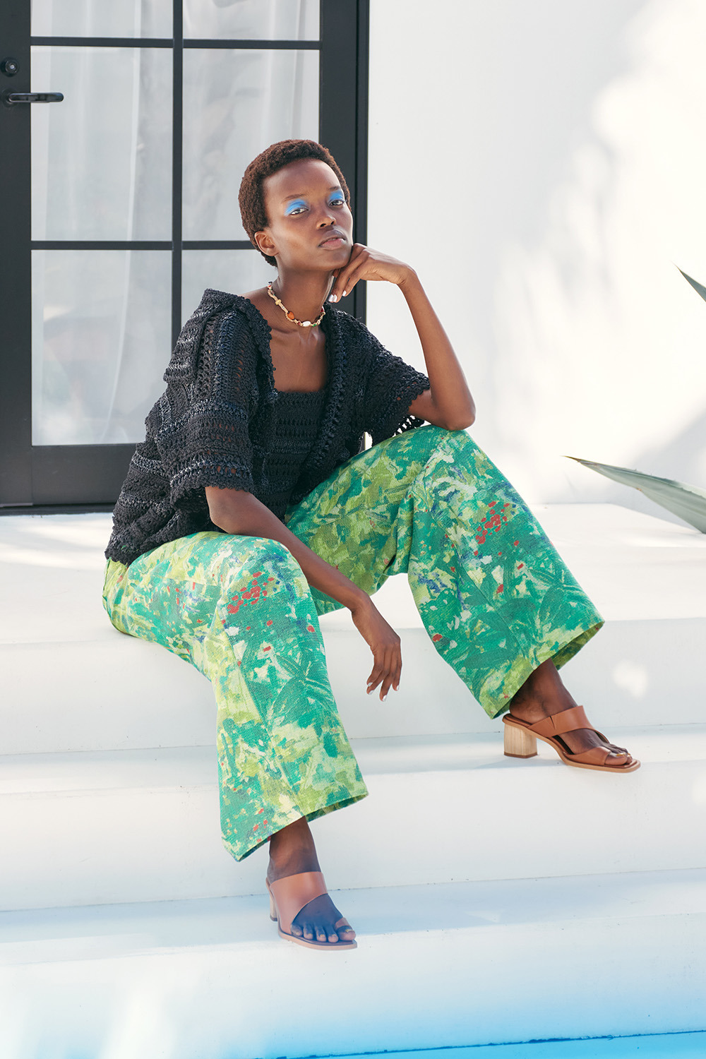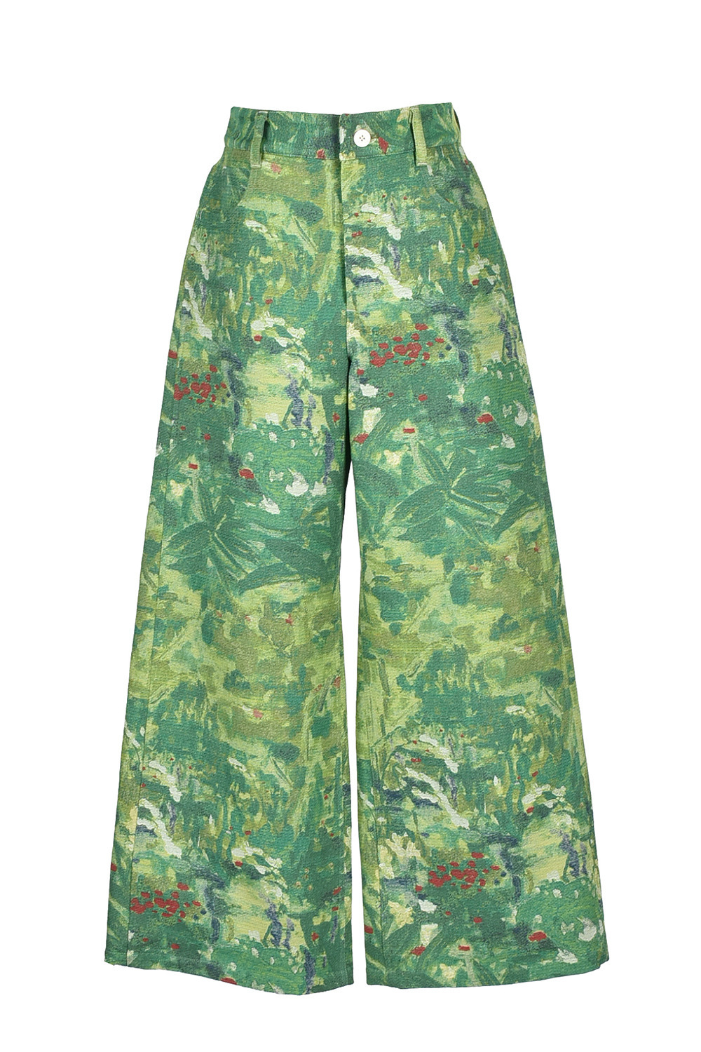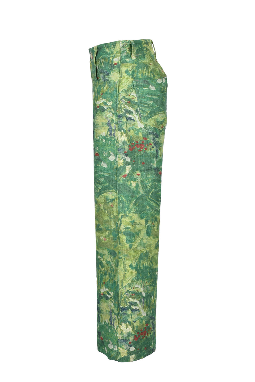 この生地をぜいたくに使った総柄のパンツは、ワイド寄りのシルエット。ハリの素材感でボディラインを拾いにくく、美しいフォルムを保ちます。
