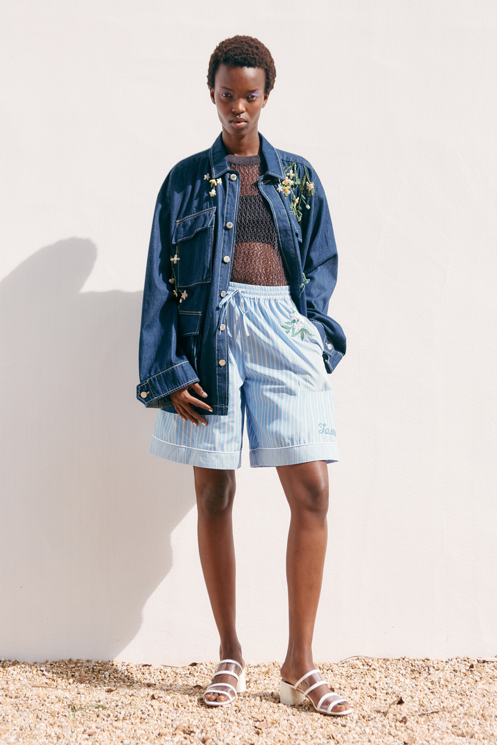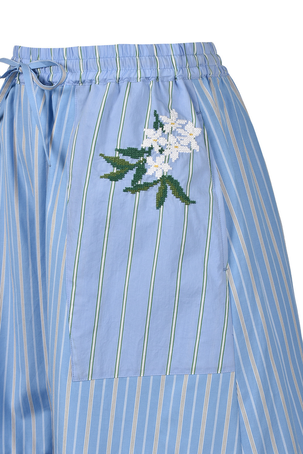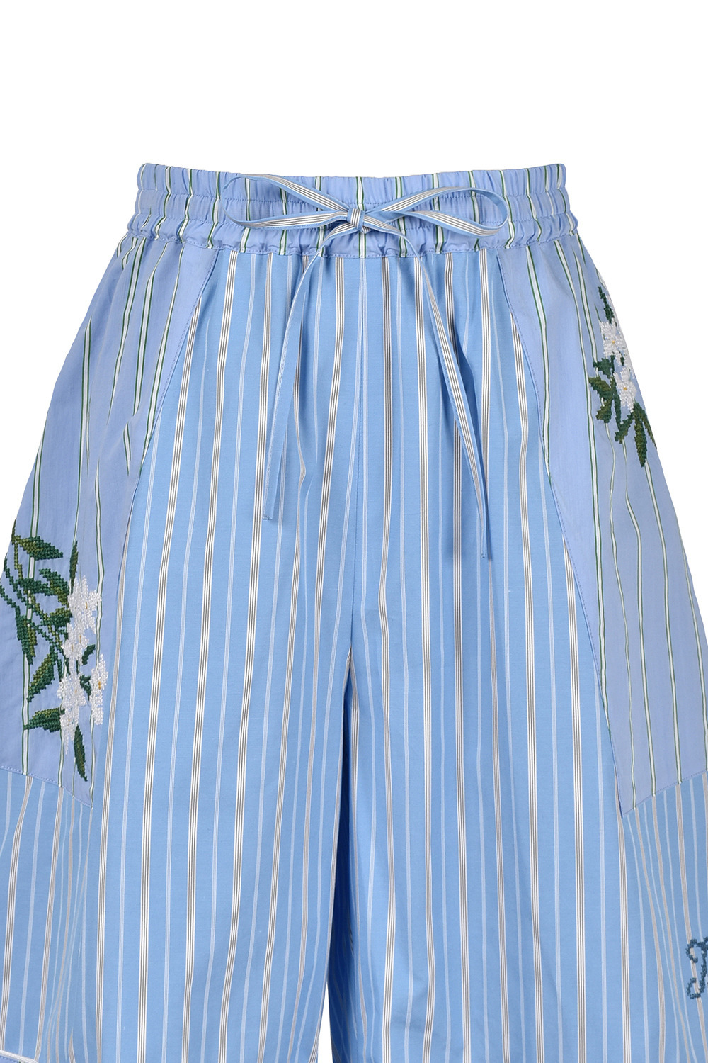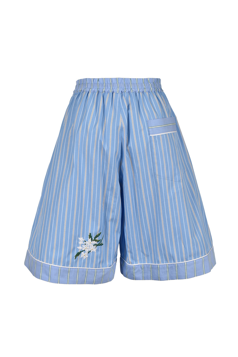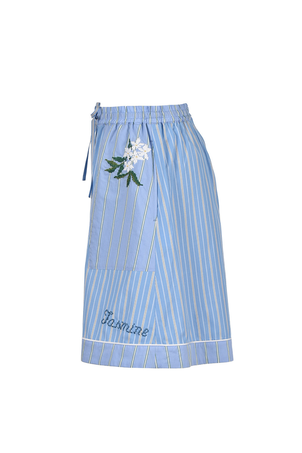 ジャスミンの花をクロスステッチであしらった、ストライプ柄ショートパンツ。