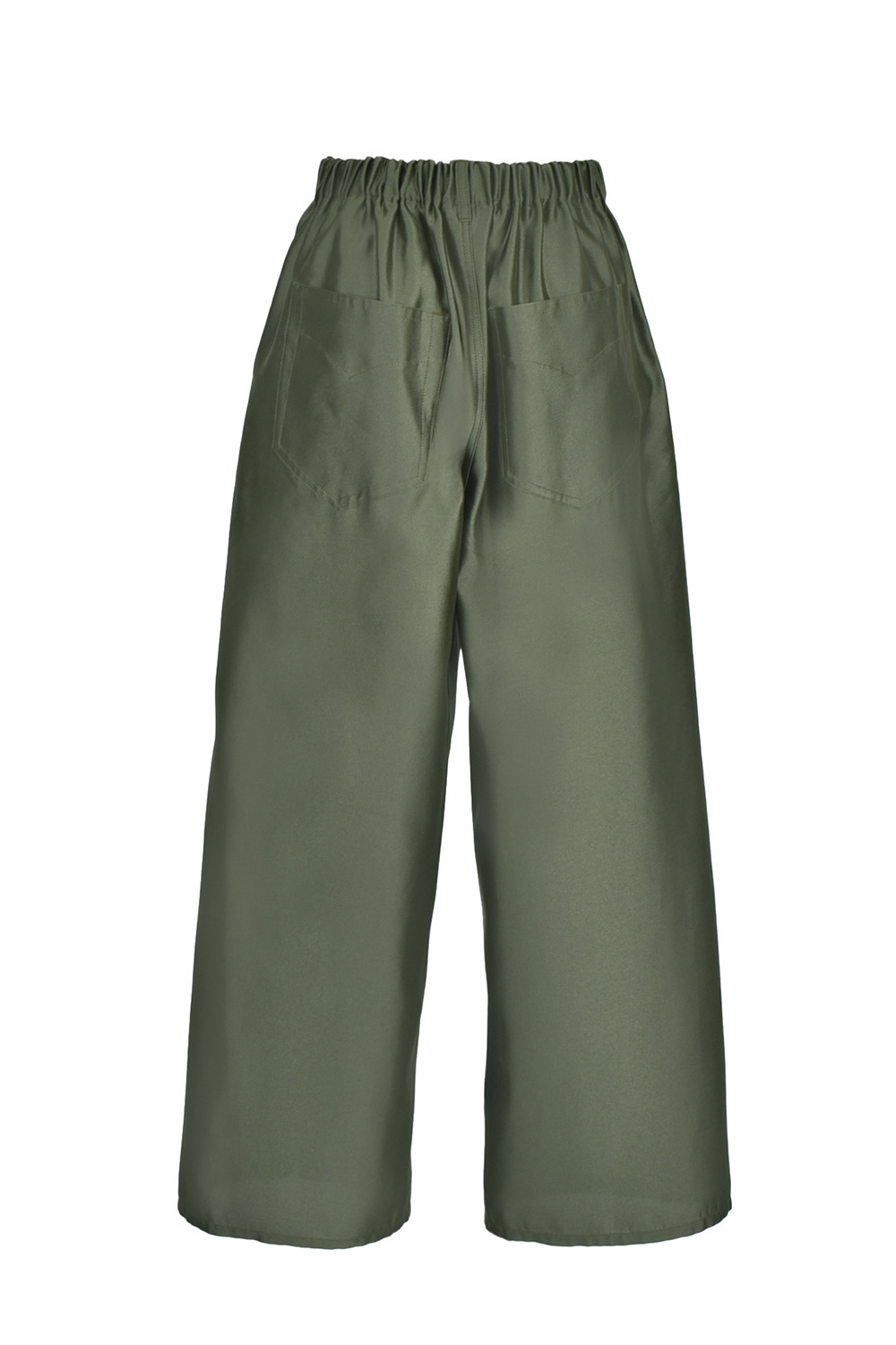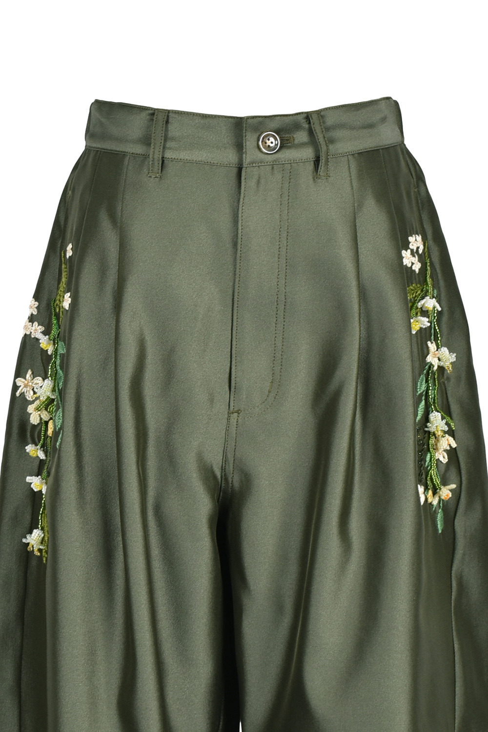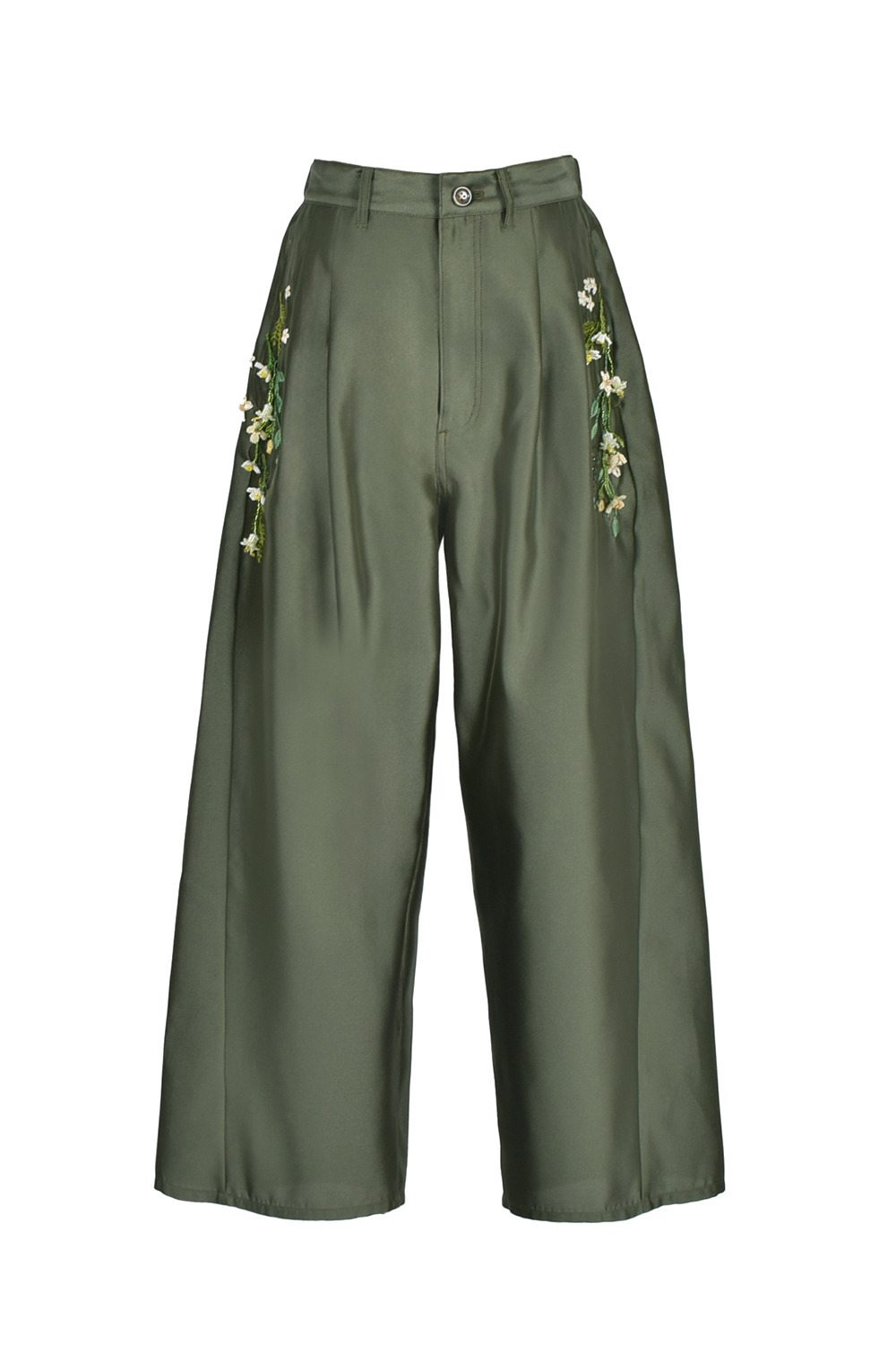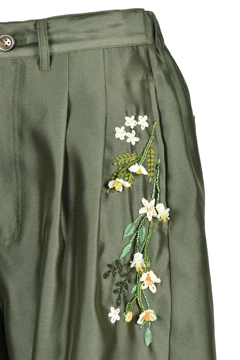 ツータックをとったゆったりしたシルエットのポケットから、花たちが咲きこぼれています。