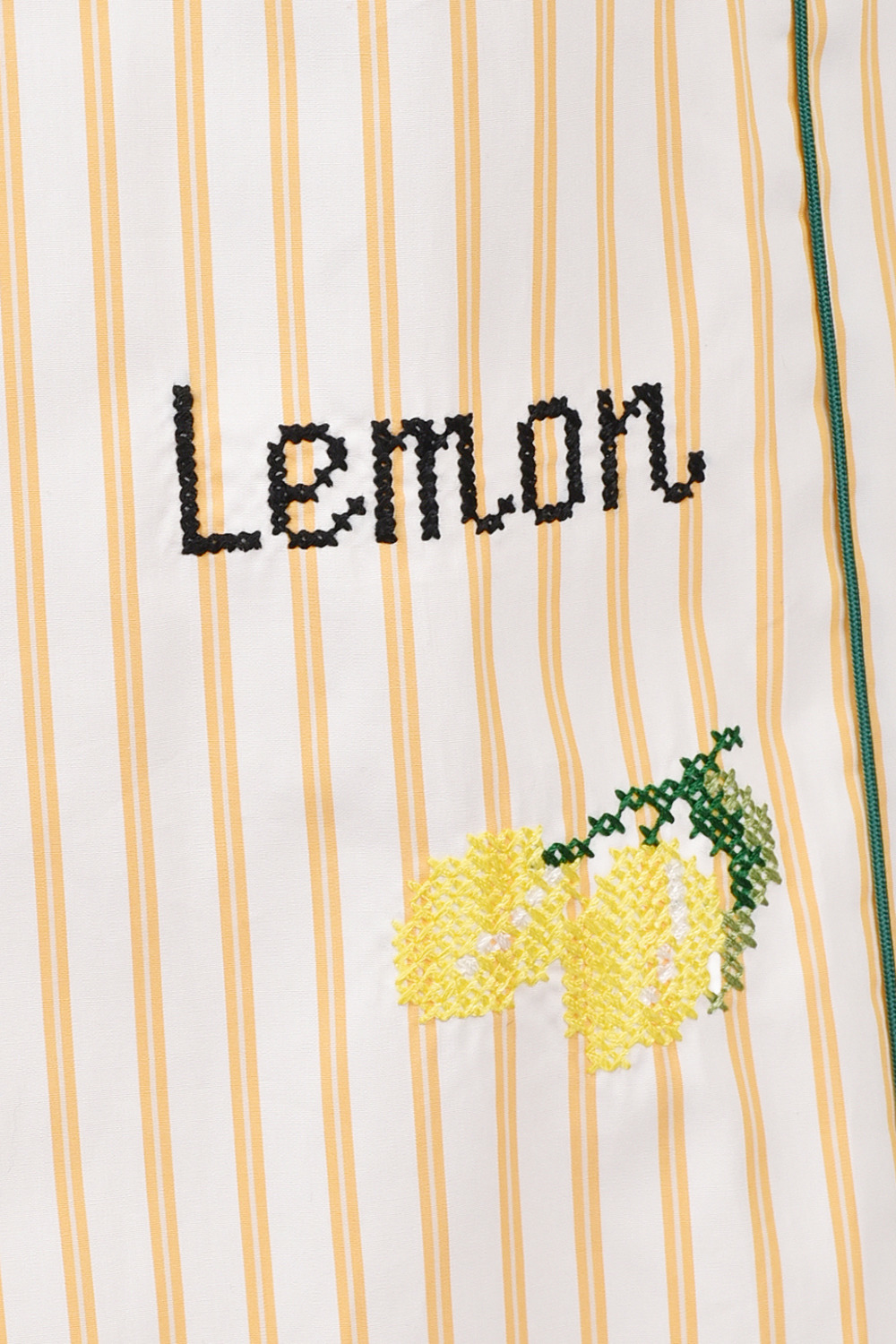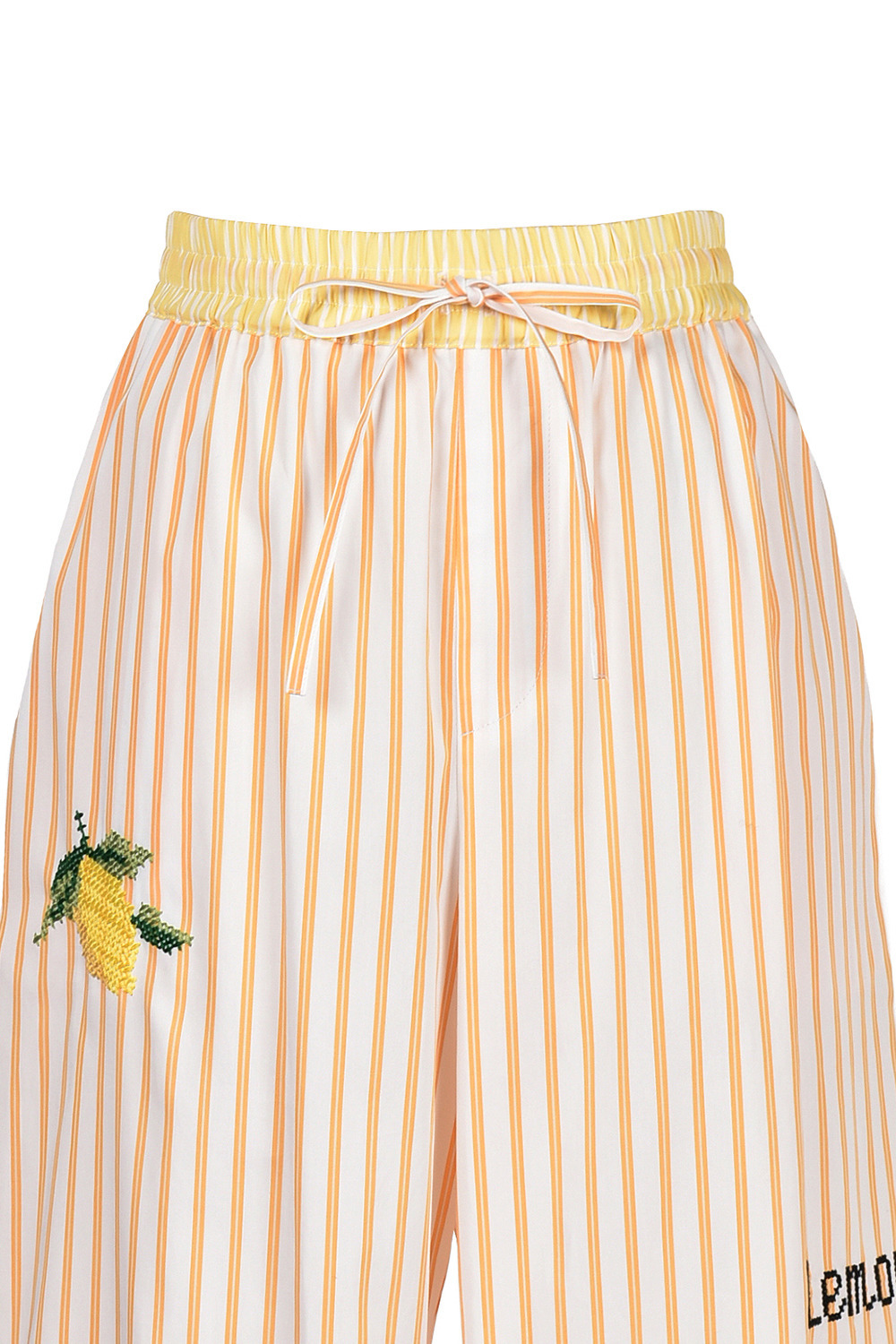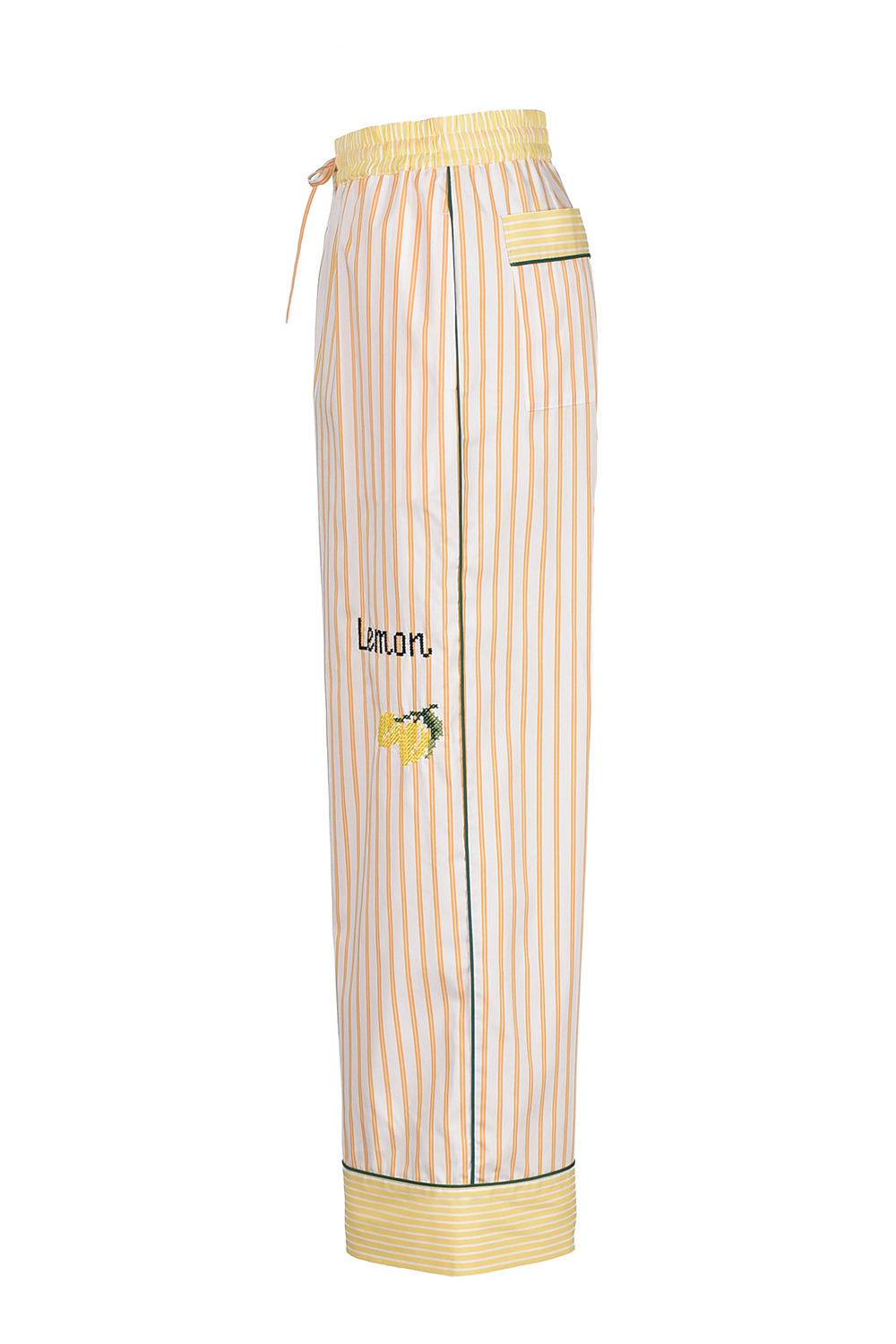 レモンをクロスステッチであしらった、ストライプ柄イージーパンツ。