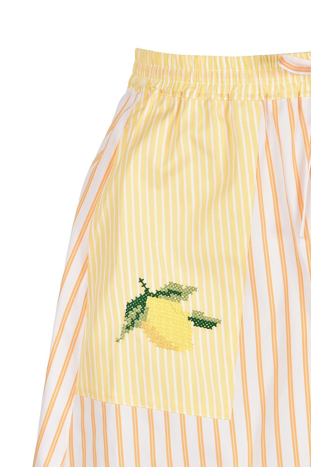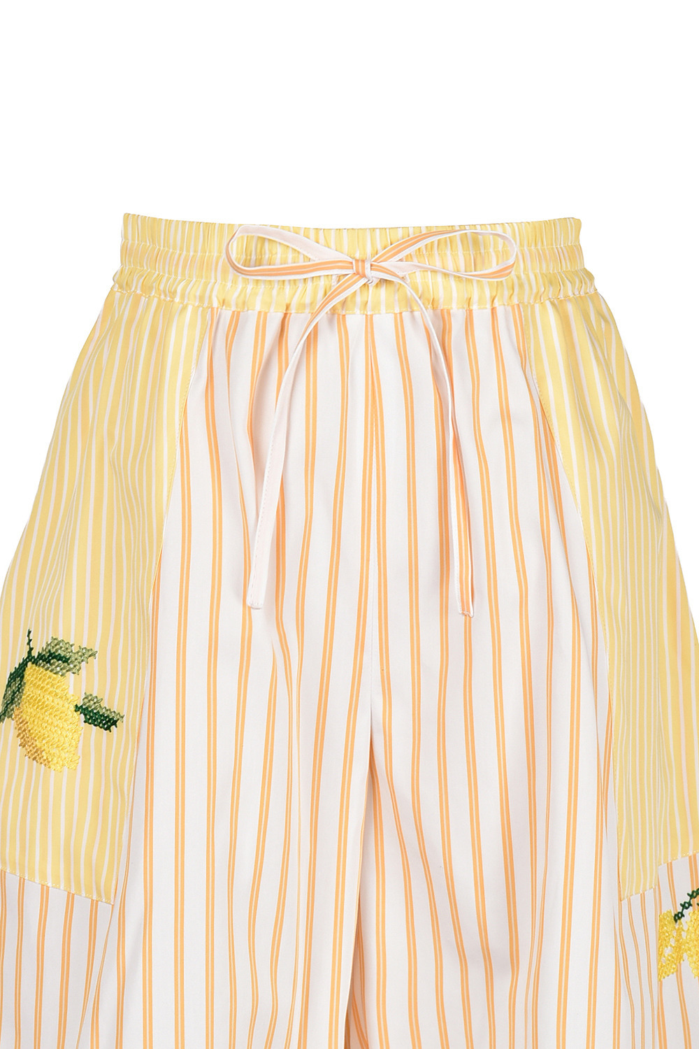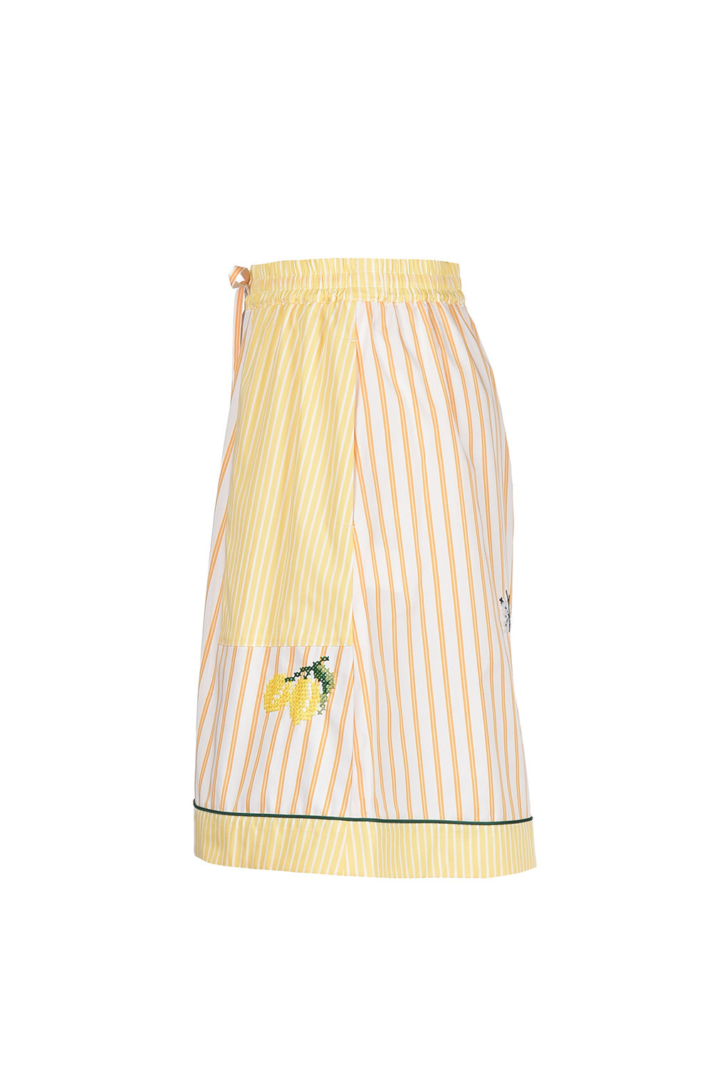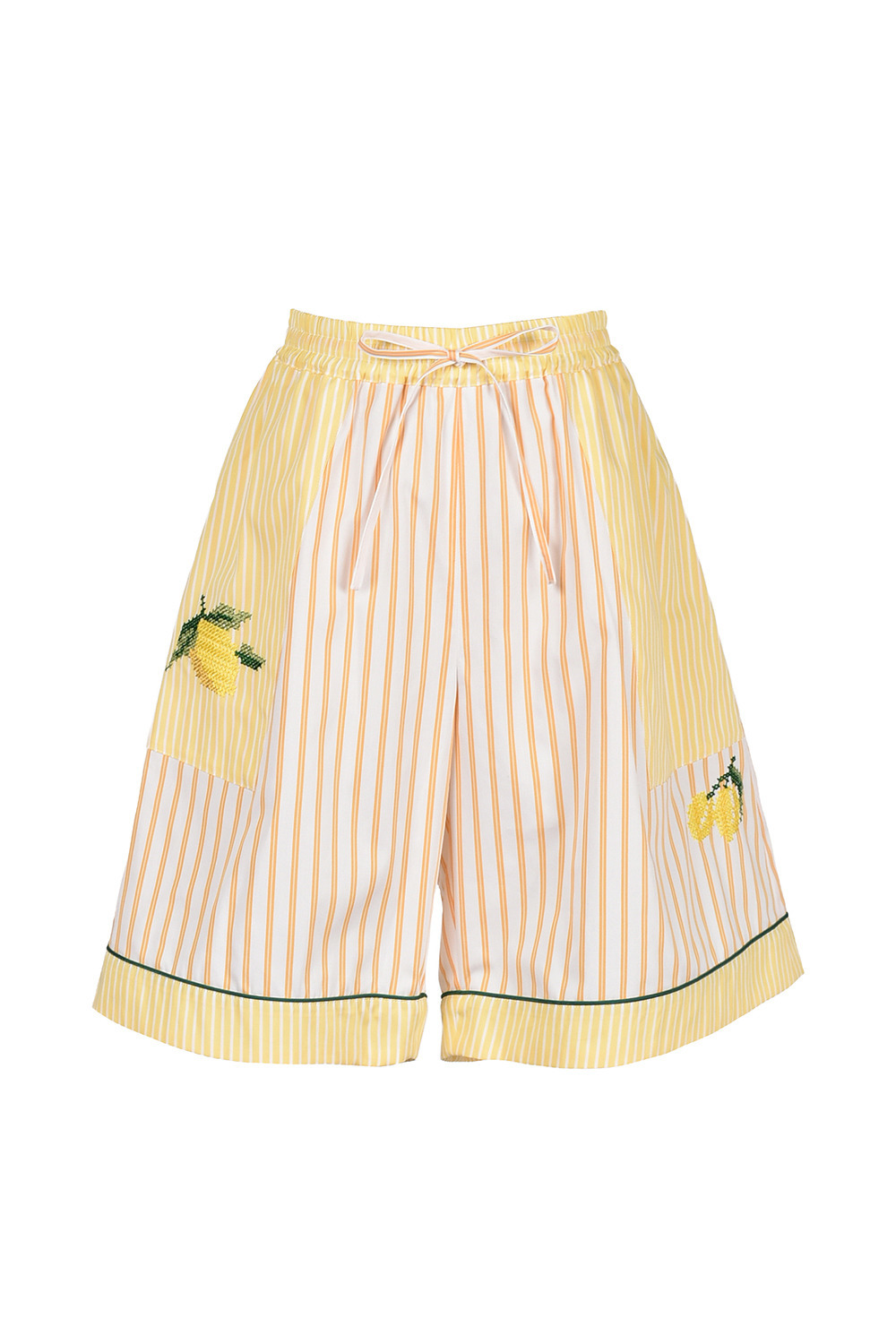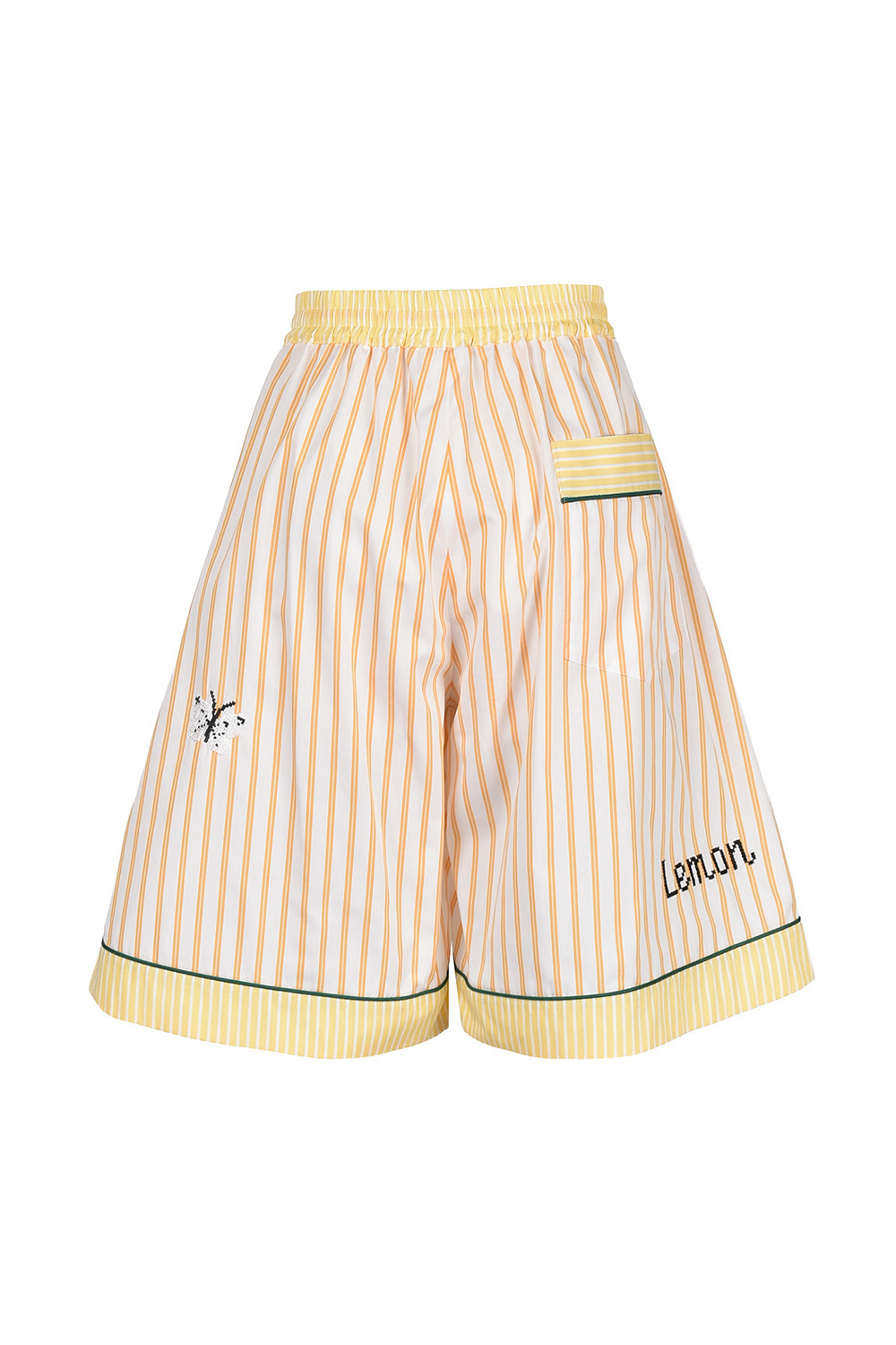 レモンをクロスステッチであしらった、ストライプ柄ショートパンツ。