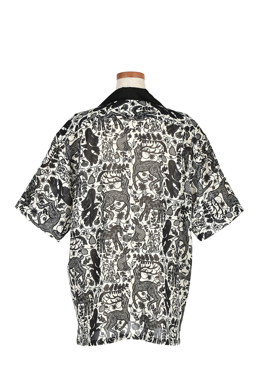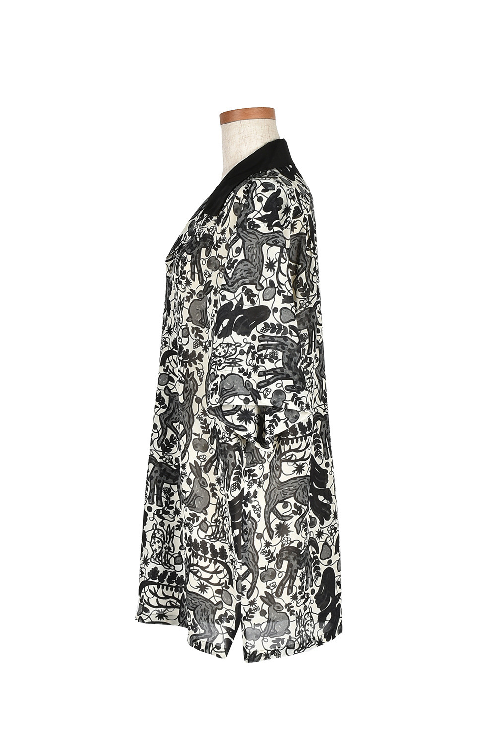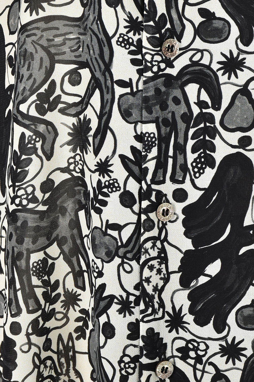 今回のコレクションのために門倉氏が描き下ろした動物モチーフのアートを、インパクトがありつつもモノトーンでシックなプリント生地に仕上げました。