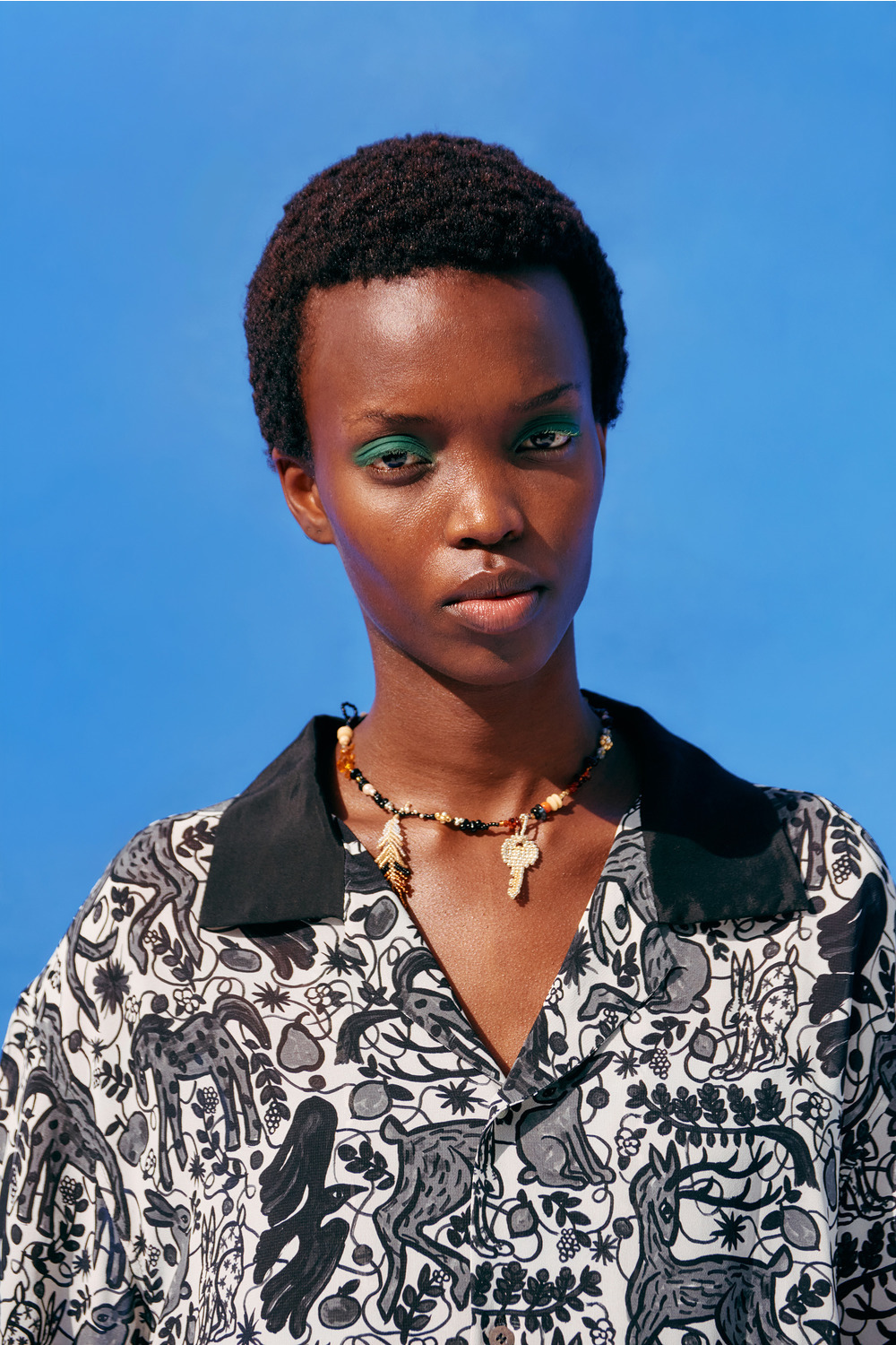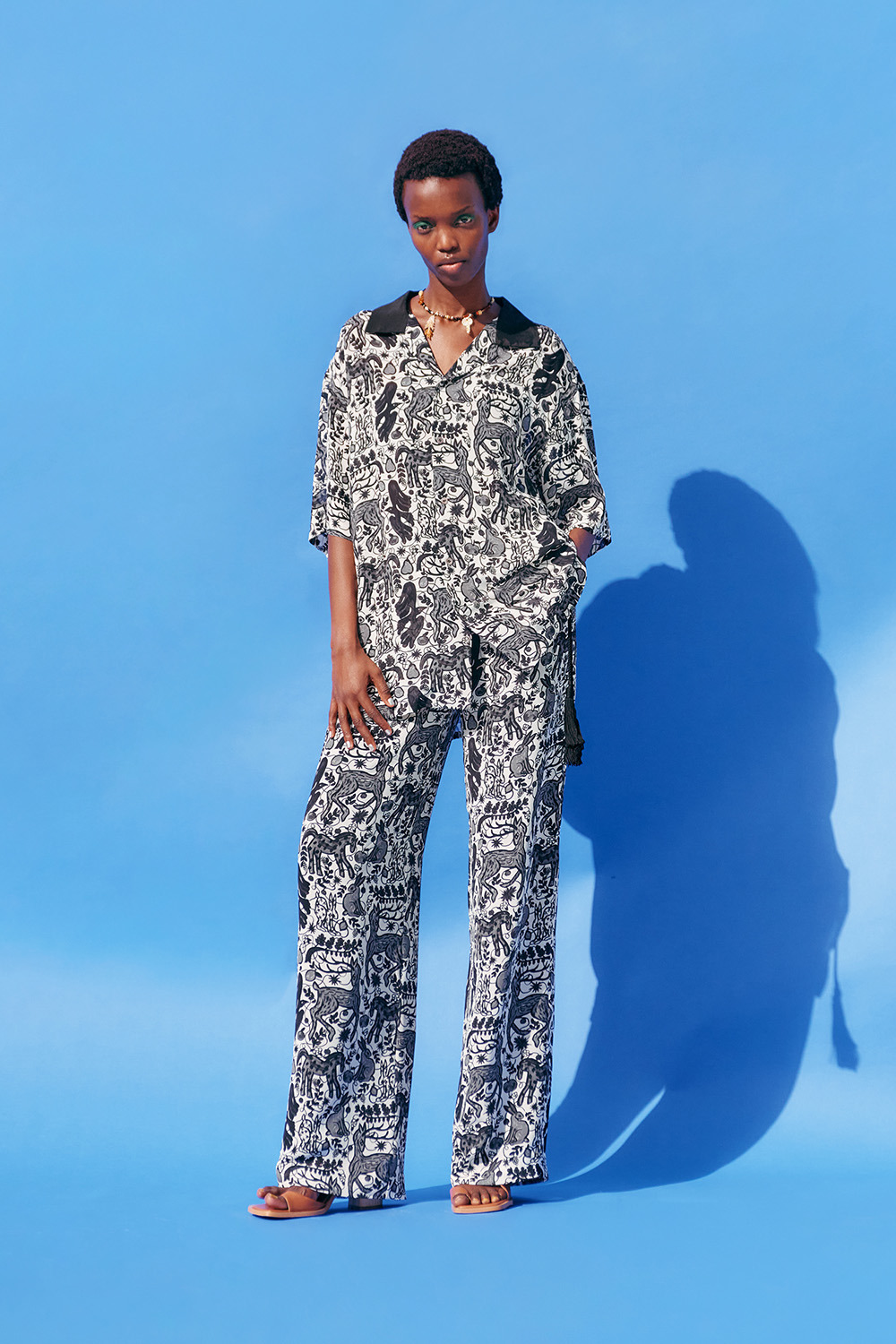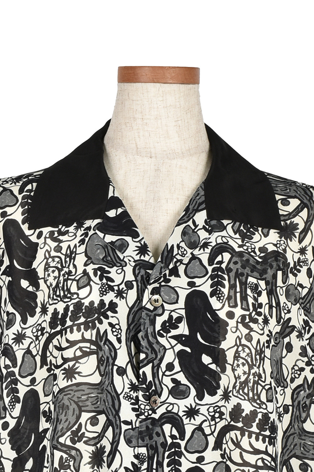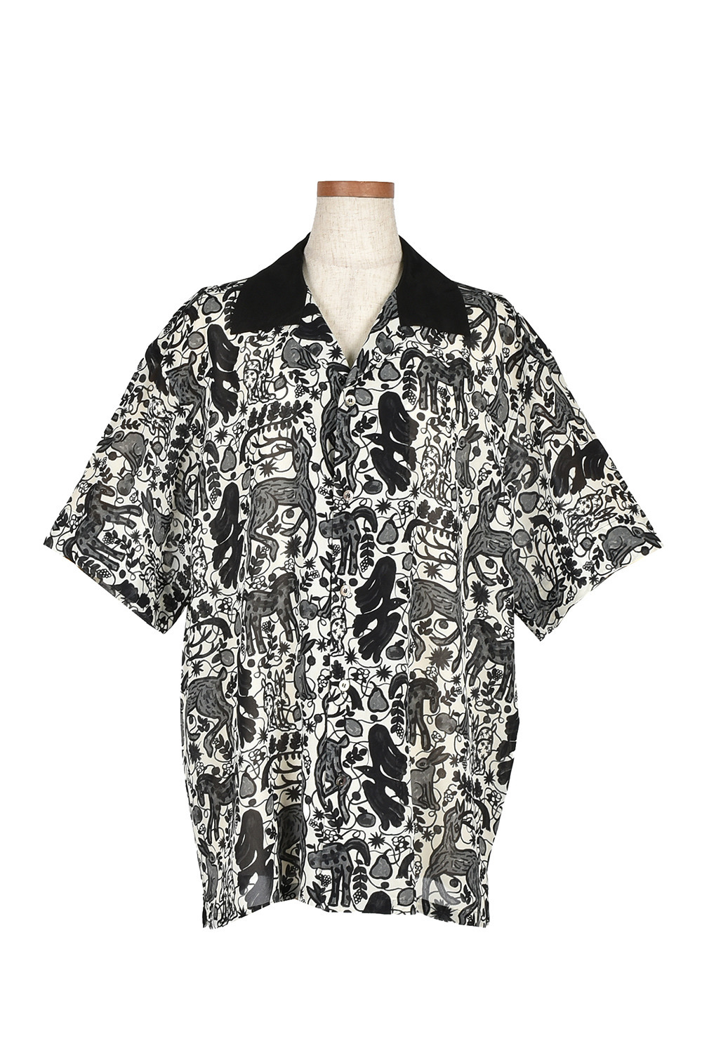 今回のコレクションのために門倉氏が描き下ろした動物モチーフのアートを、インパクトがありつつもモノトーンでシックなプリント生地に仕上げました。