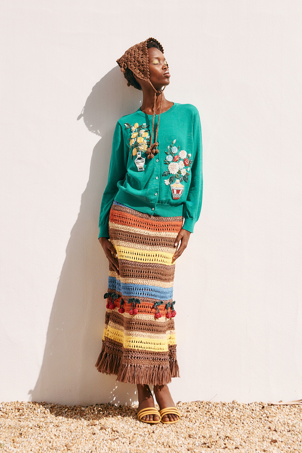 ゆるやかにフィットするロングスカートは、裾にチェリーモチーフが並び、大人かわいいアクセントに。